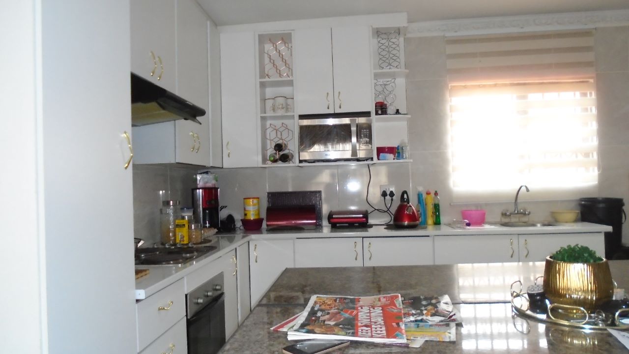The built-in cupboards offer plenty of storage, keeping your kitchen organized and clutter-free.