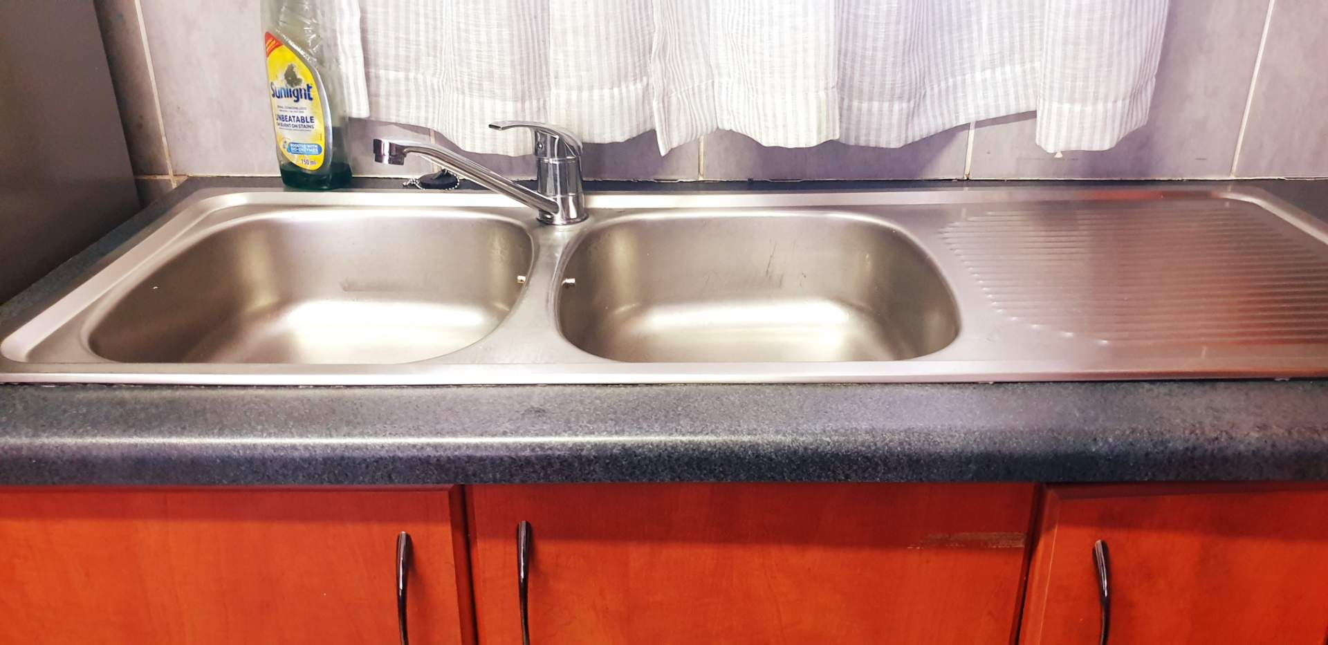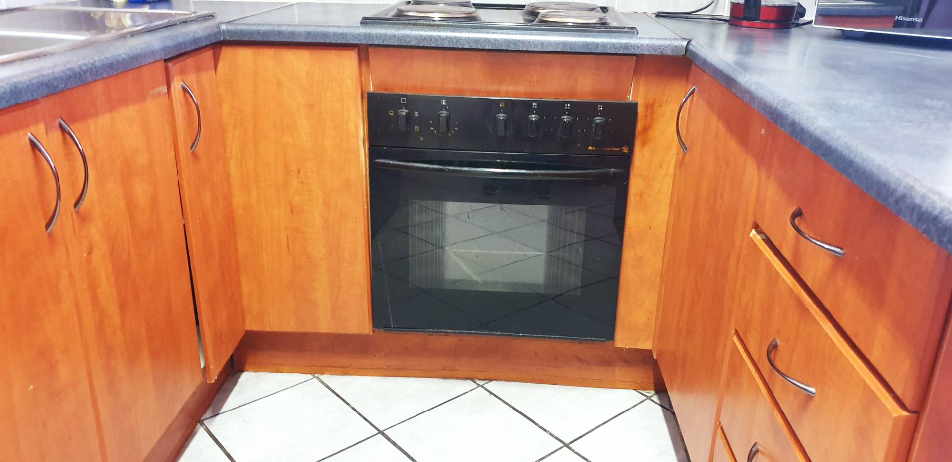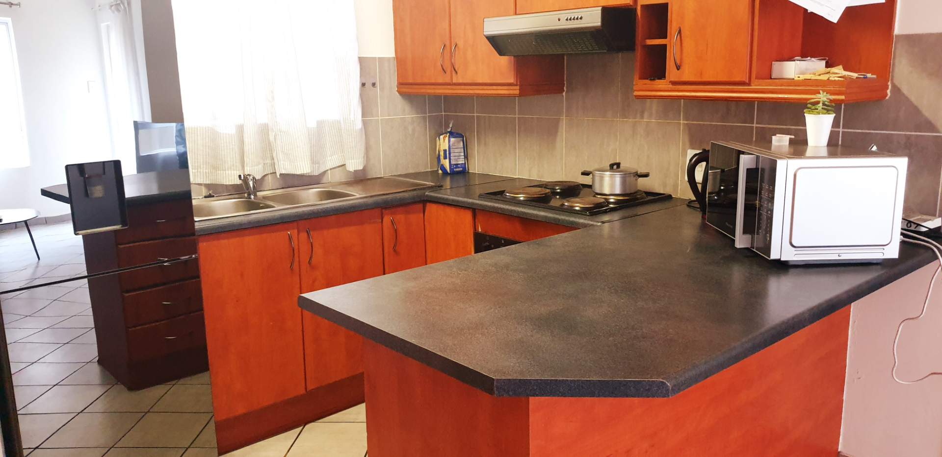 The heart of the home is the inviting lounge area, which seamlessly flows into an open-plan kitchen. Here, you'll find elegant countertops and stylish cherry wood cupboards, providing both functionality and sophistication for all your culinary adventures. Whether you're entertaining guests or enjoying a quiet night in, this open-plan space offers the perfect ambiance for any occasion.