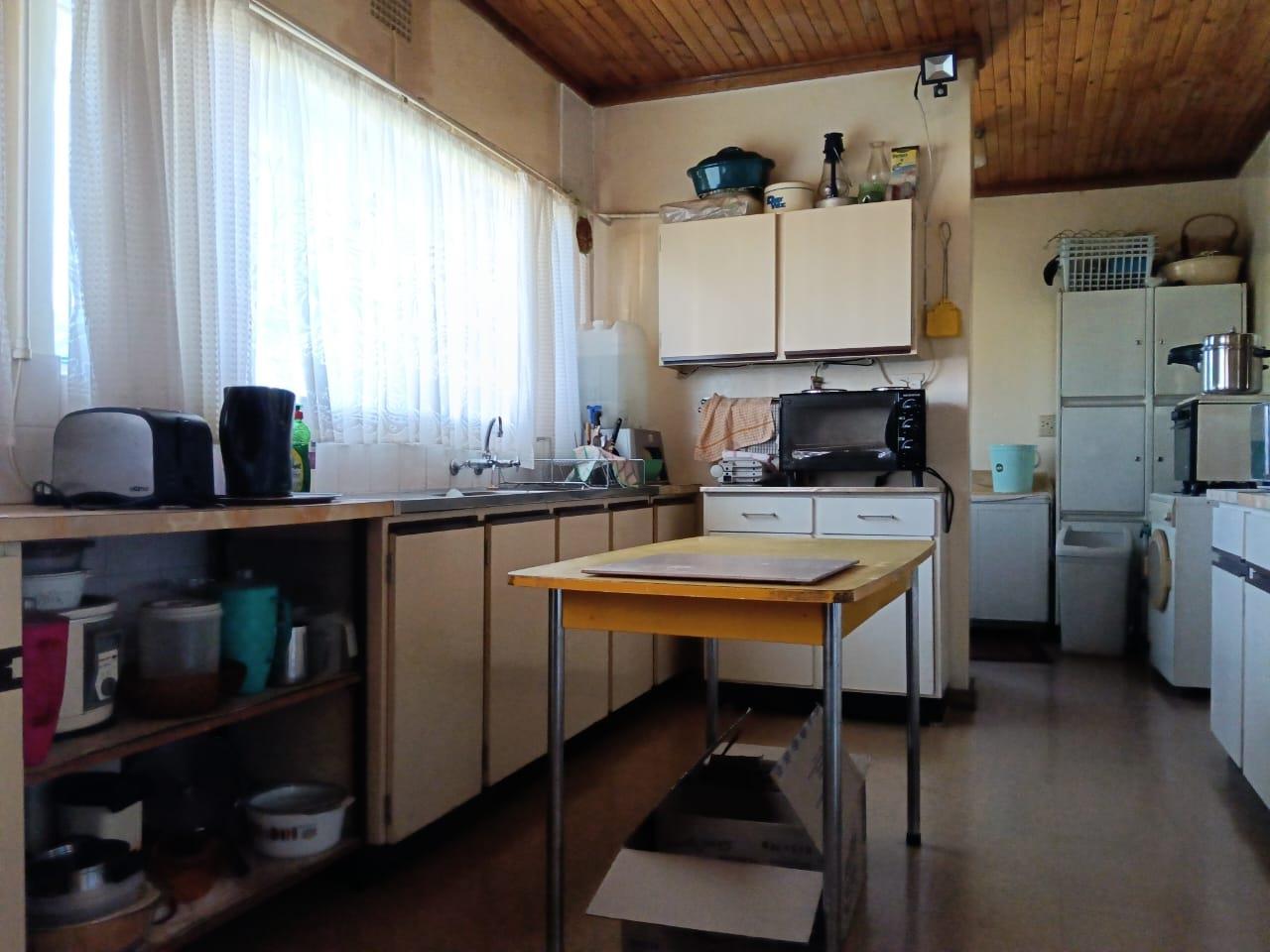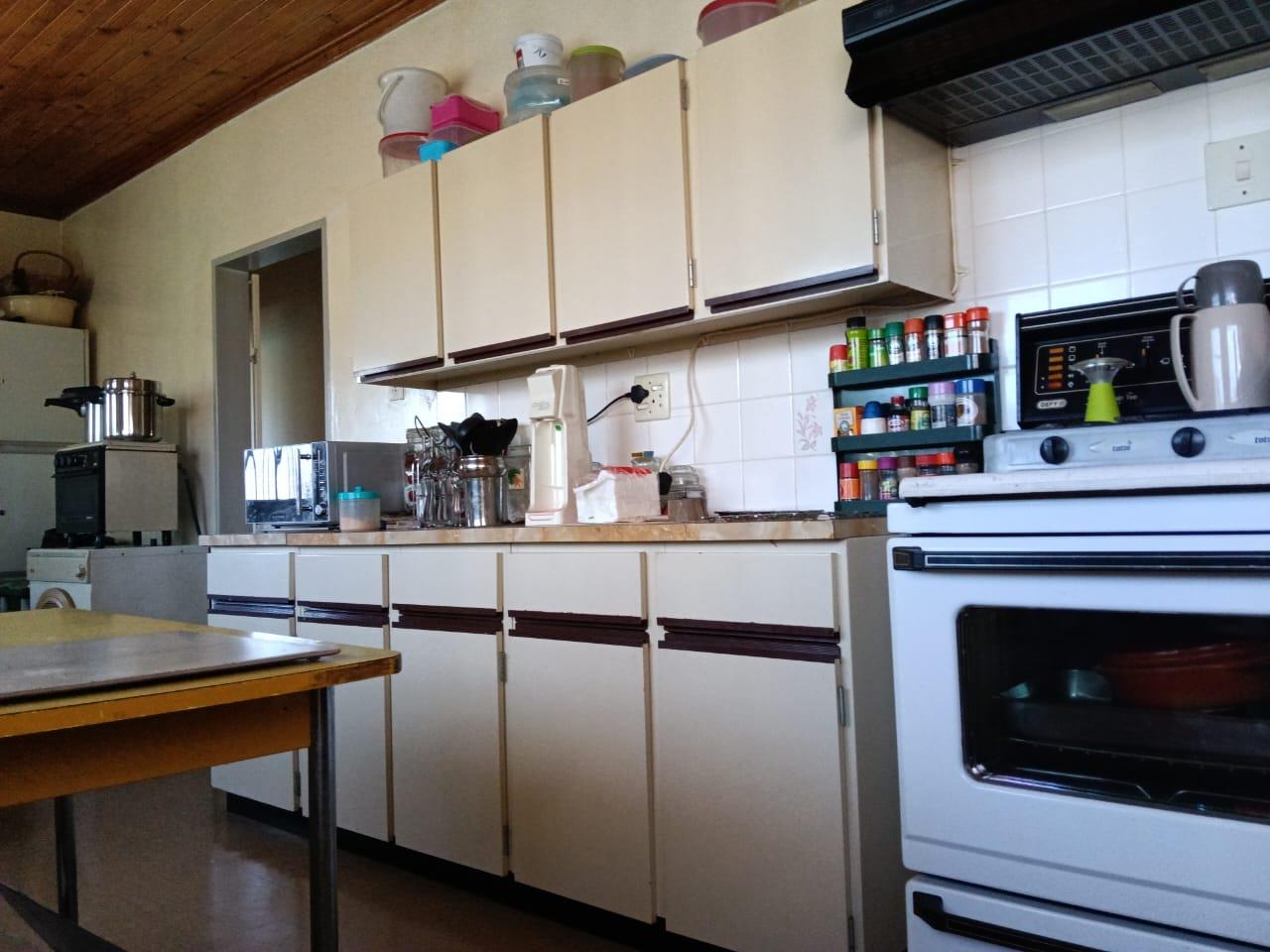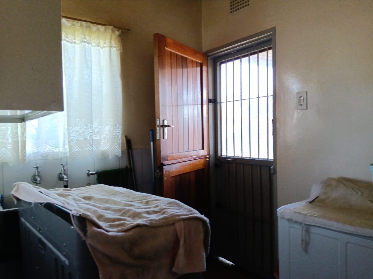 A fully fitted kitchen with built-in cupboards and separate laundry area all with tiled floors