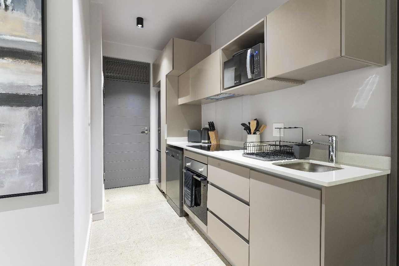This well-appointed air conditioned apartment, with built-in cupboards and quality finishes, has a central living area harmoniously integrated into the well equipped kitchen, featuring a Bosch hob with extractor fan, under-counter Bosch oven, ample cupboard storage space, an additional space for a fridge, washing machine (or dishwasher) and microwave.