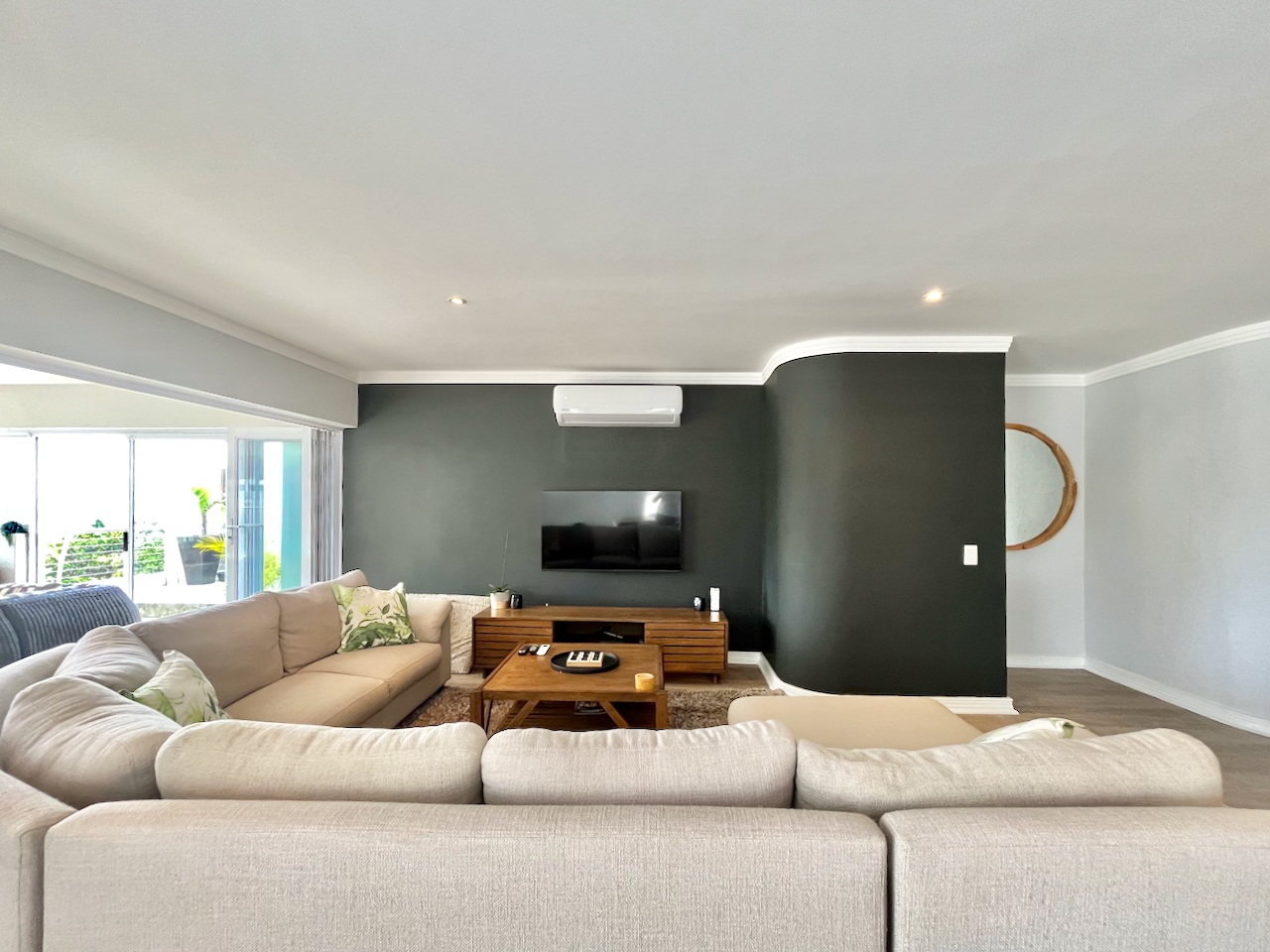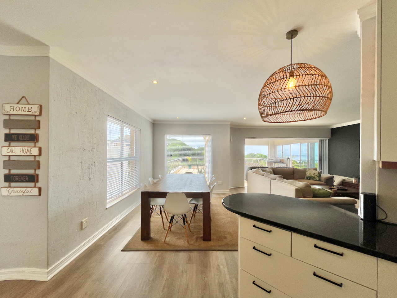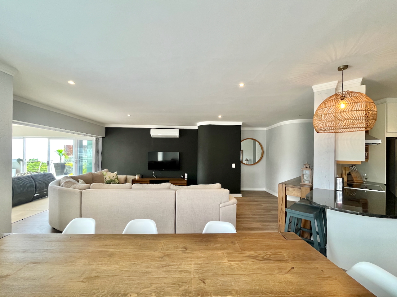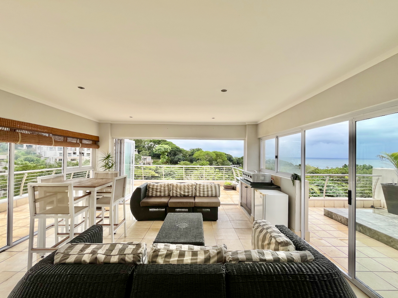 Floor-to-ceiling sliding doors extend the living space onto an expansive, partially enclosed, covered patio, where uninterrupted views of the ocean and surrounds provide the perfect backdrop for outdoor dining or relaxed coastal living.