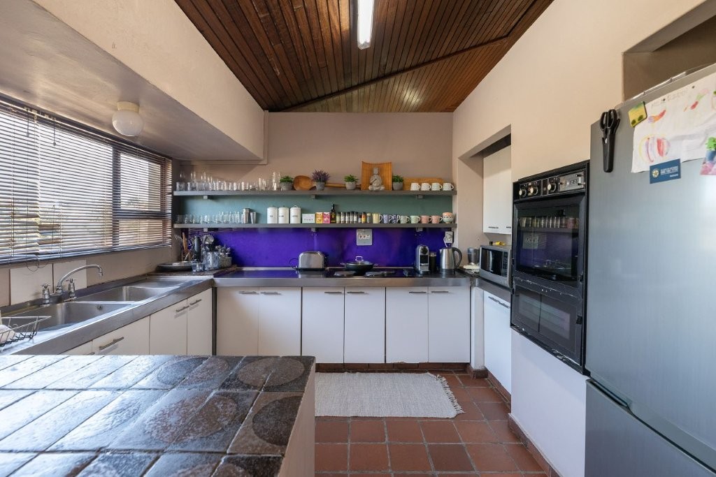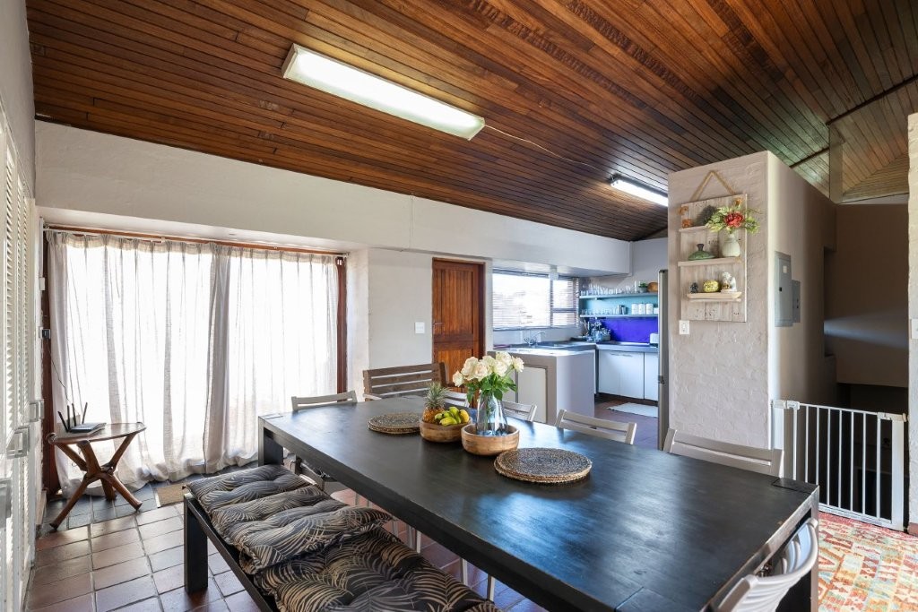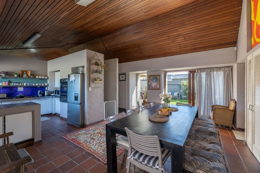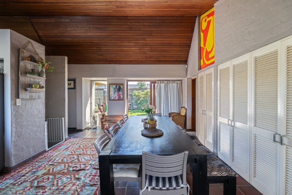 A bright, open-plan lounge and dining area form one wing of the house, with sliding doors that open effortlessly to the garden — ideal for indoor-outdoor living and entertaining. The dining area is complemented by built-in storage and flows seamlessly into a spacious, well-appointed kitchen.