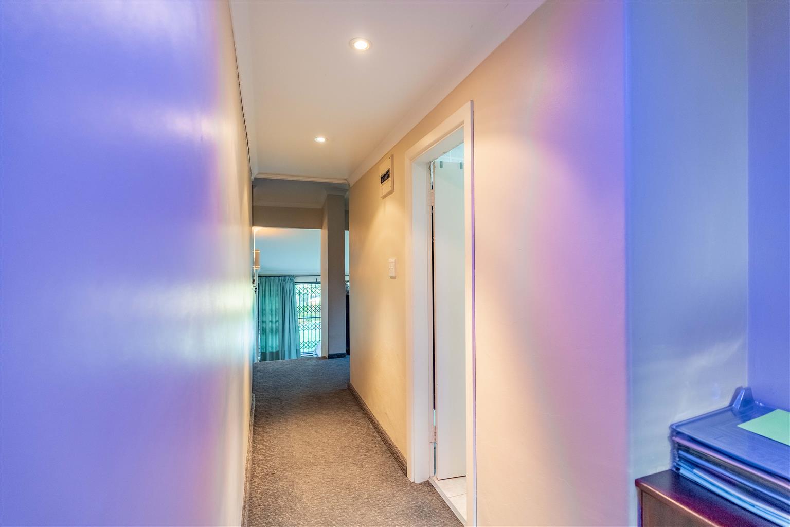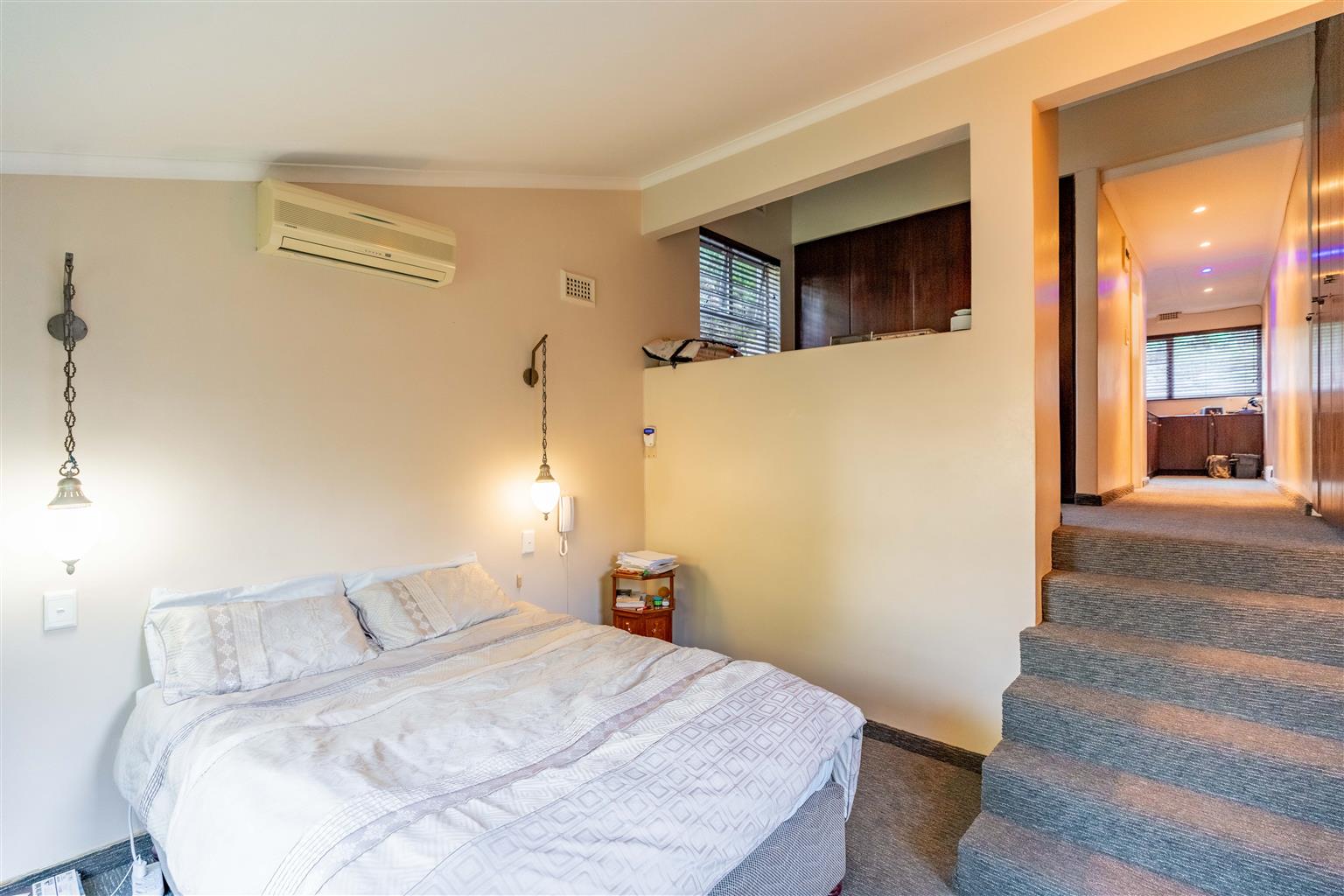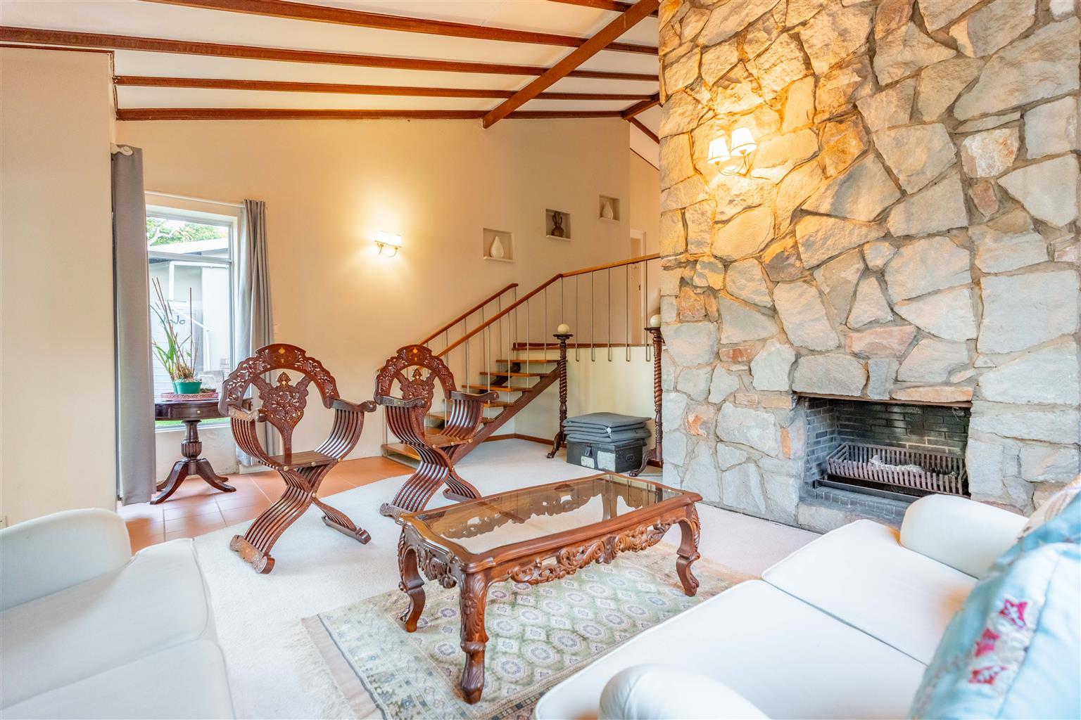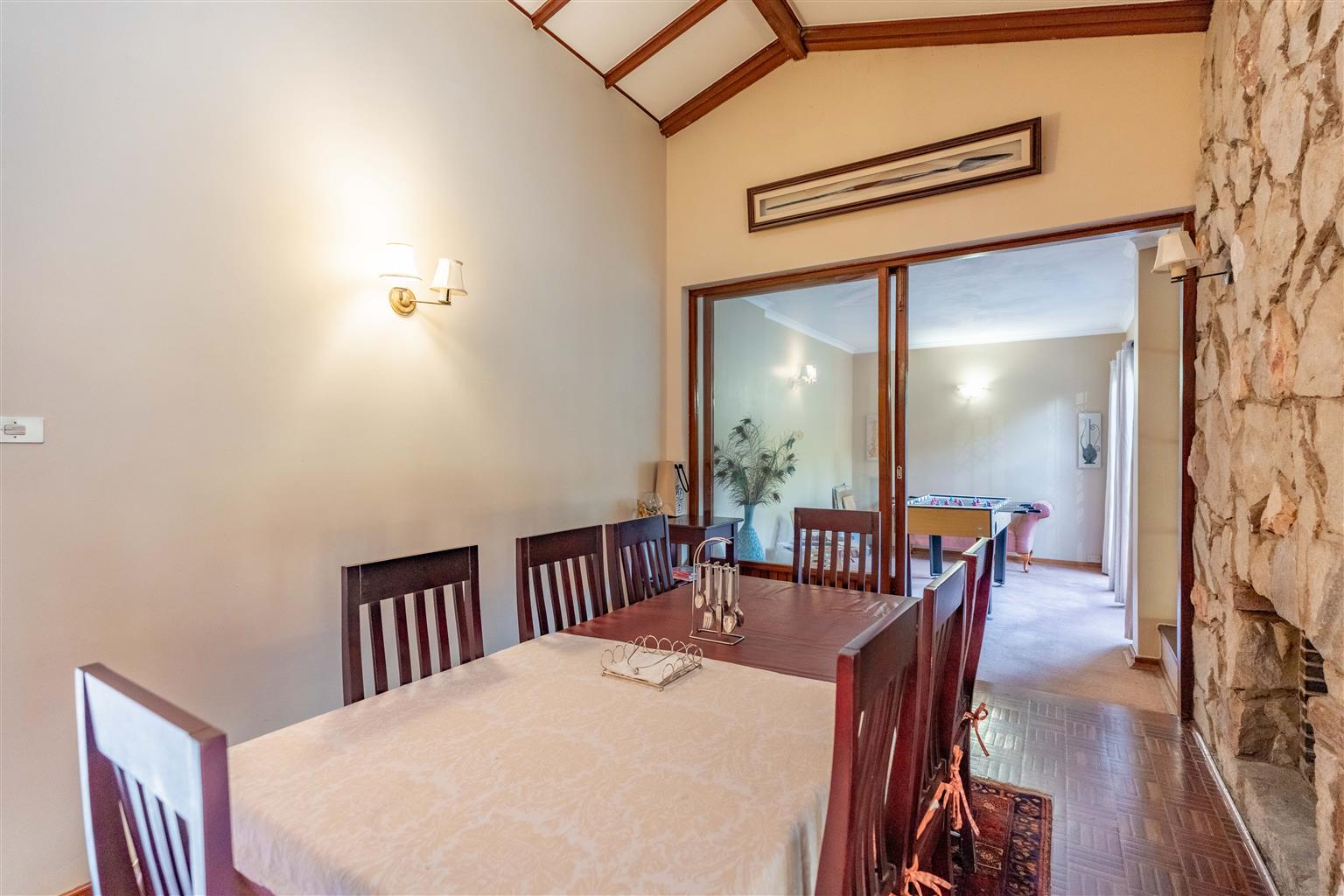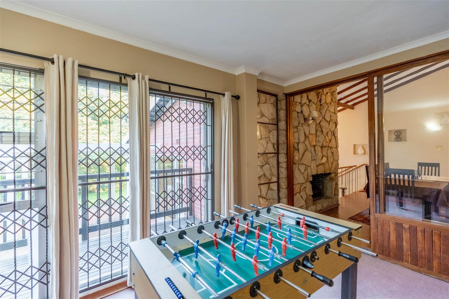 Step into the main house, a masterpiece of living space designed for both comfort and grandeur. The heart of the home is a fully fitted granite kitchen, featuring a gas hob, oven, extractor, double sink, and abundant cupboard and counter space. A separate laundry and scullery/pantry room adds practicality. The living spaces are a dream for entertainers and families alike. Enjoy three distinct areas: a TV lounge opening to a wooden balcony with breathtaking views of the parklike gardens, a versatile entertainment/games room (perfect as a kids’ playroom or study), and a formal sunken lounge flowing seamlessly onto an expansive covered entertainment patio. A dining room with a charming fireplace adds warmth and sophistication for intimate gatherings.