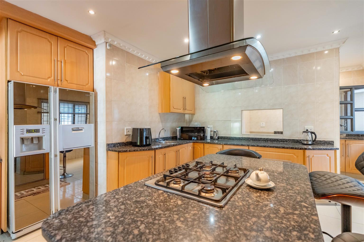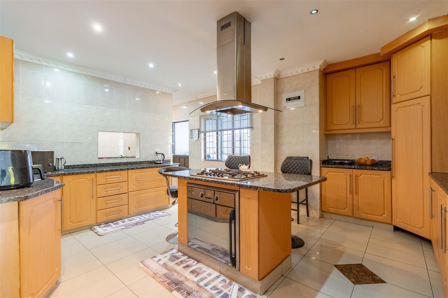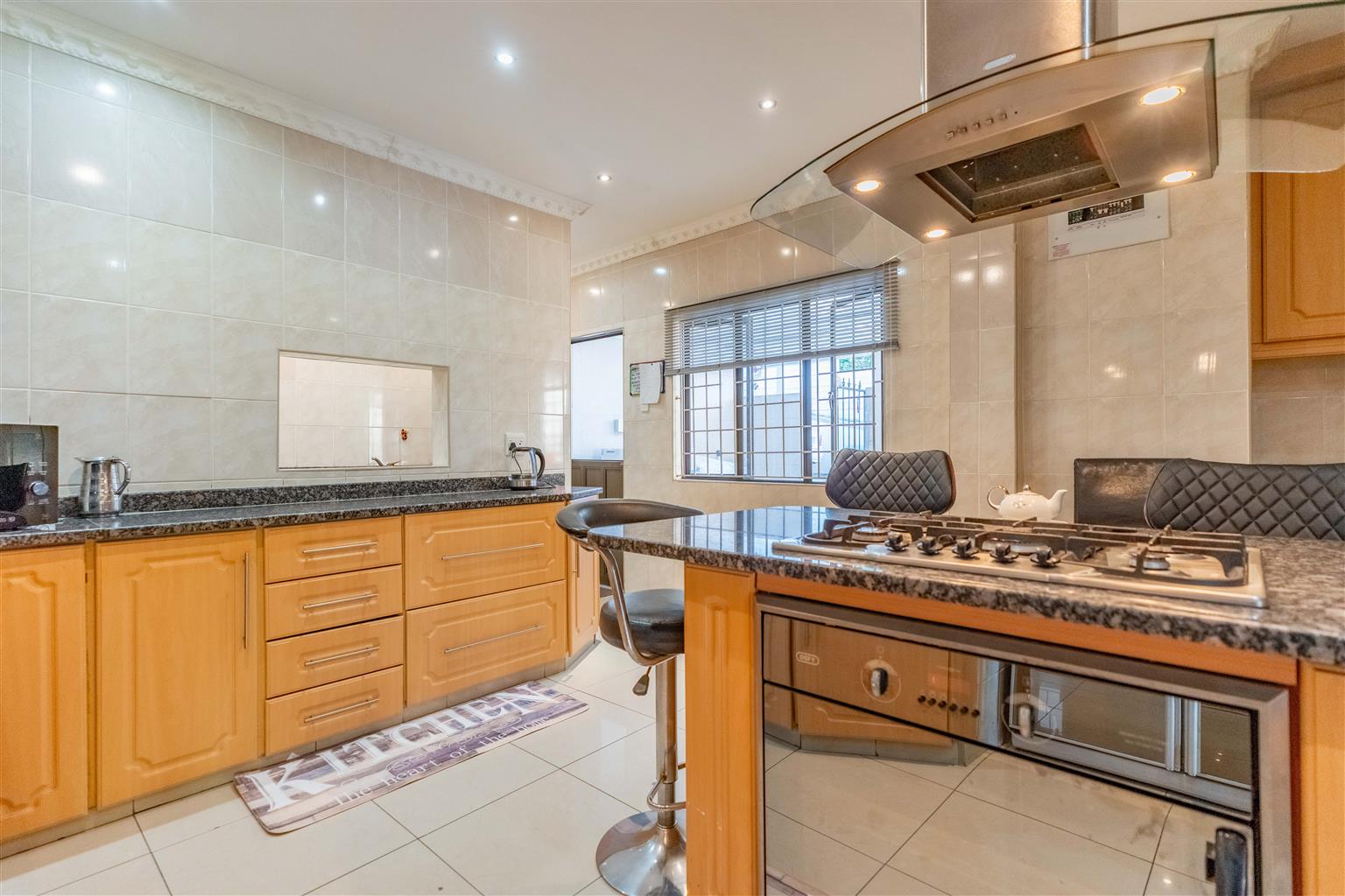 The modern kitchen, with elegant granite countertops, a gas hob, under-counter oven, and a stylish centre island, is ideal for family meals, complemented by a separate scullery for laundry and storage to keep things organized.