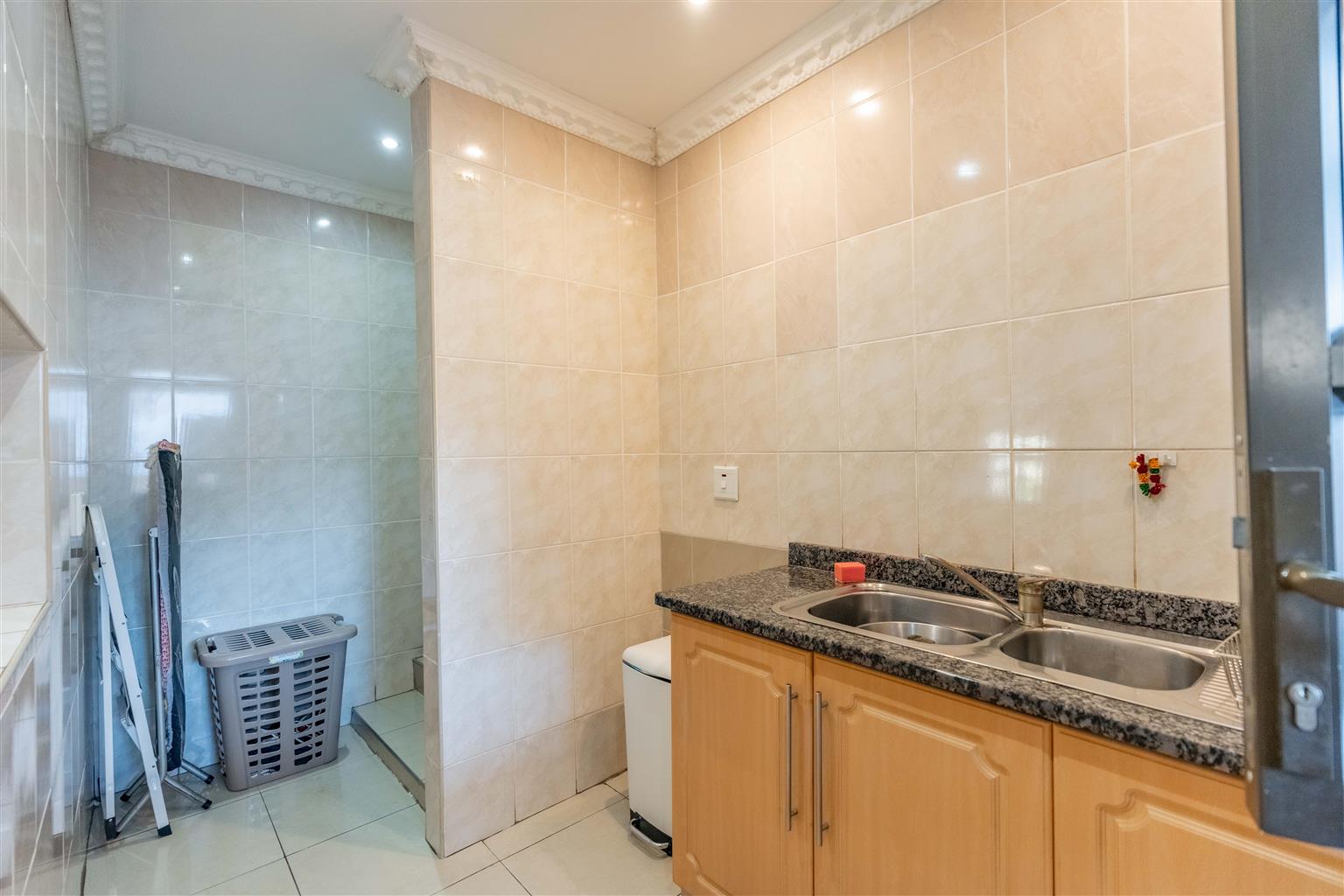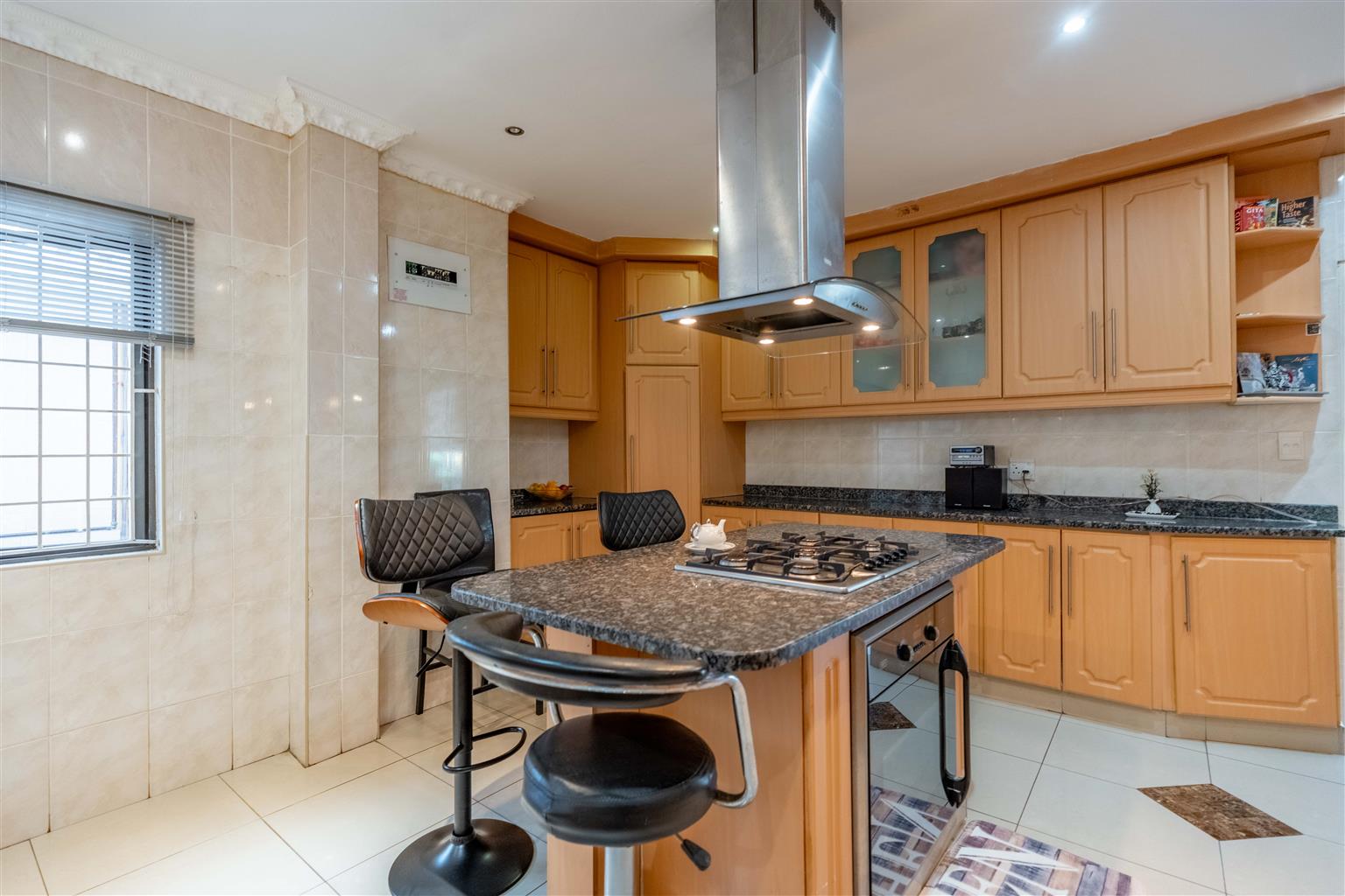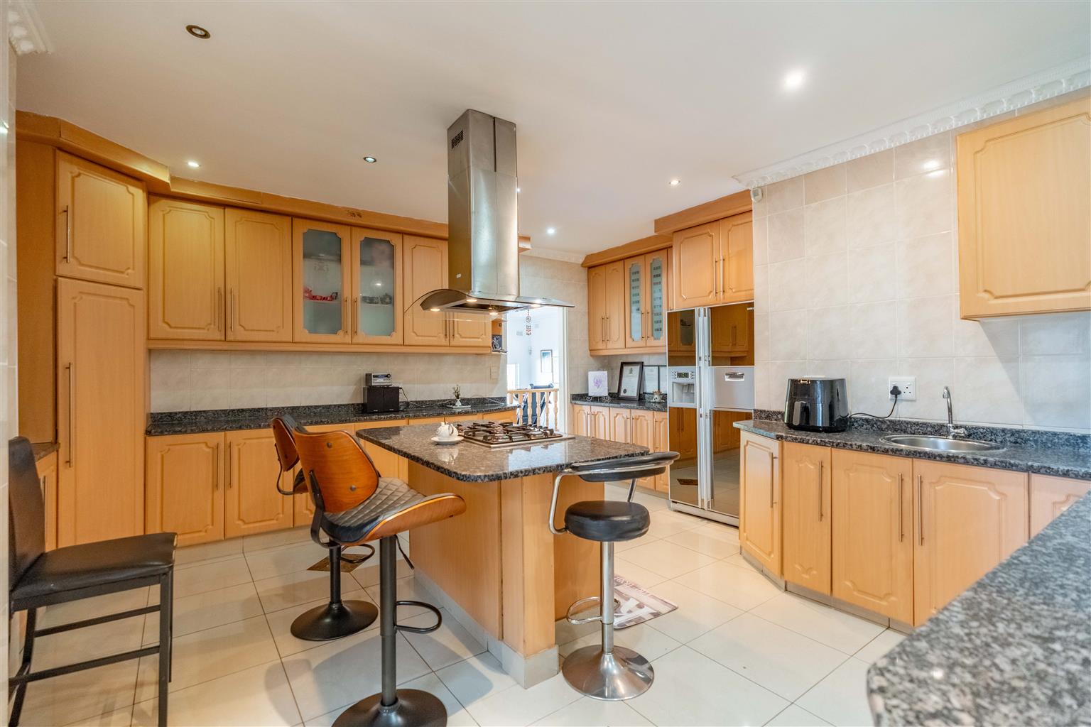 The modern kitchen, with elegant granite countertops, a gas hob, under-counter oven, and a stylish centre island, is ideal for family meals, complemented by a separate scullery for laundry and storage to keep things organized.