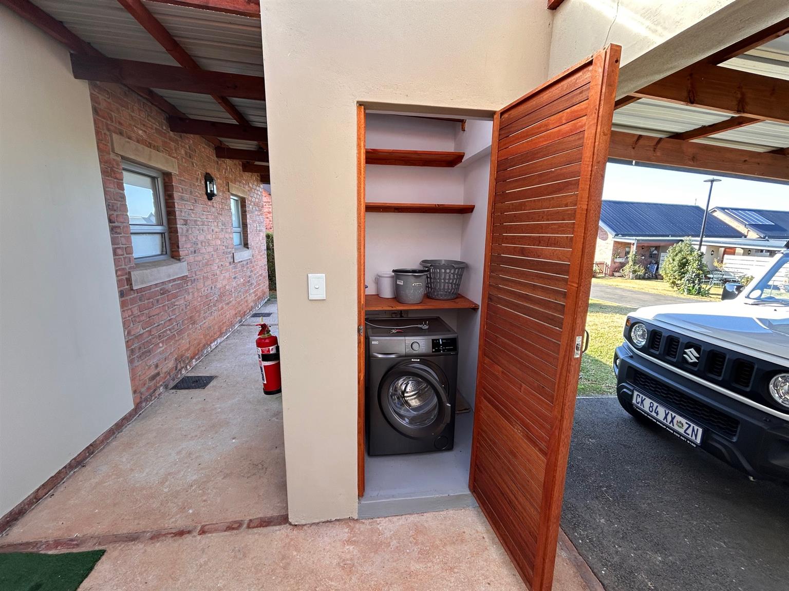 A single carport, +-18sqm is conveniently placed at the front of the unit which leads to a covered verandah and the front entrance. To the right of the entrance there is a compact storeroom which can accommodate a washing machine below the shelving.