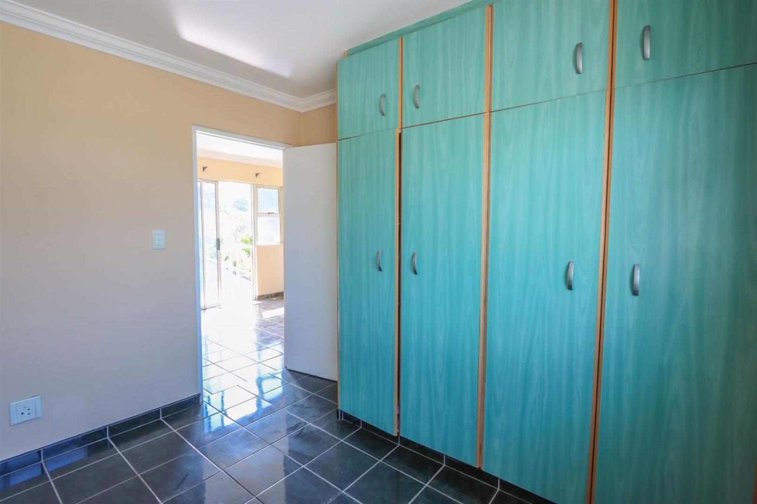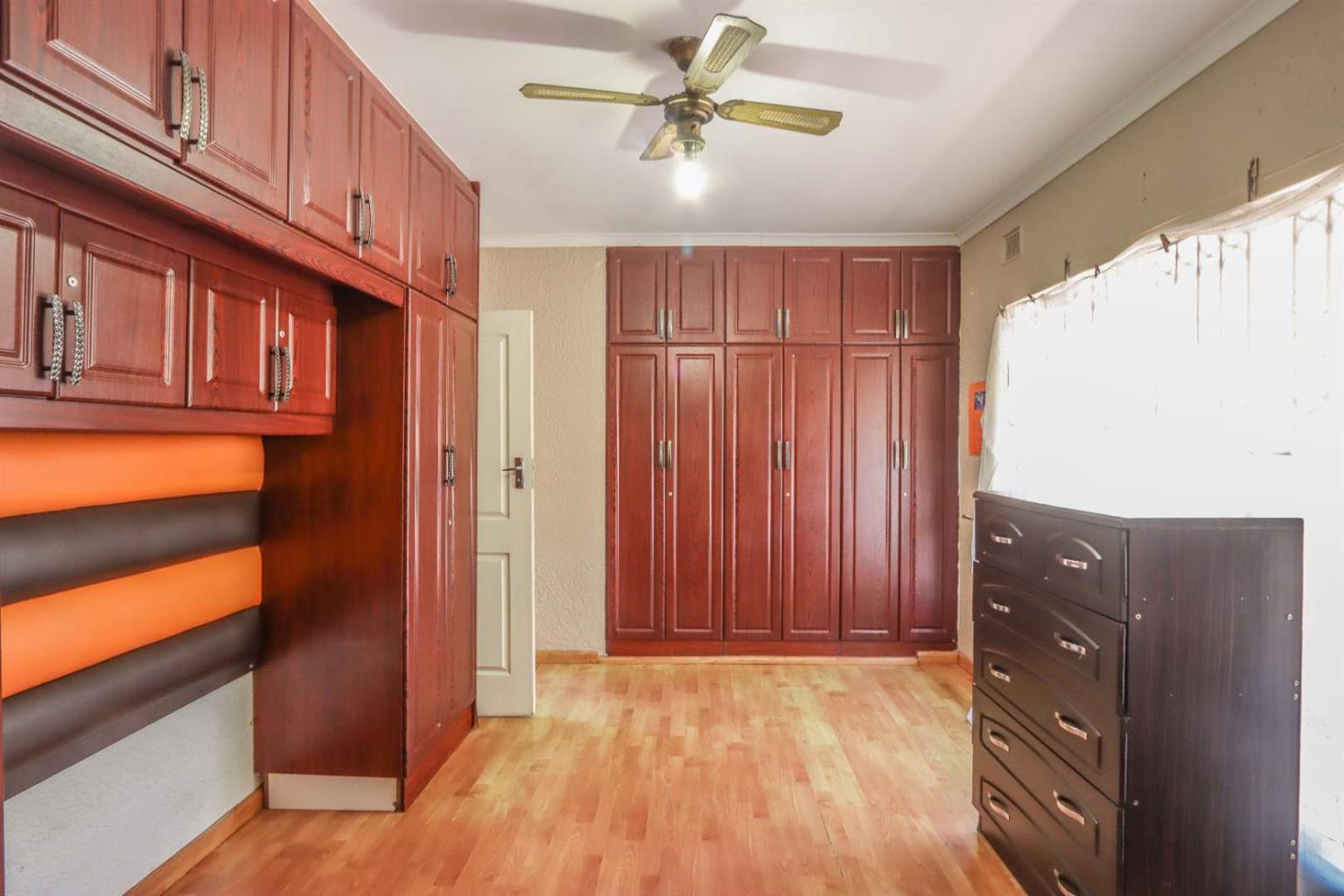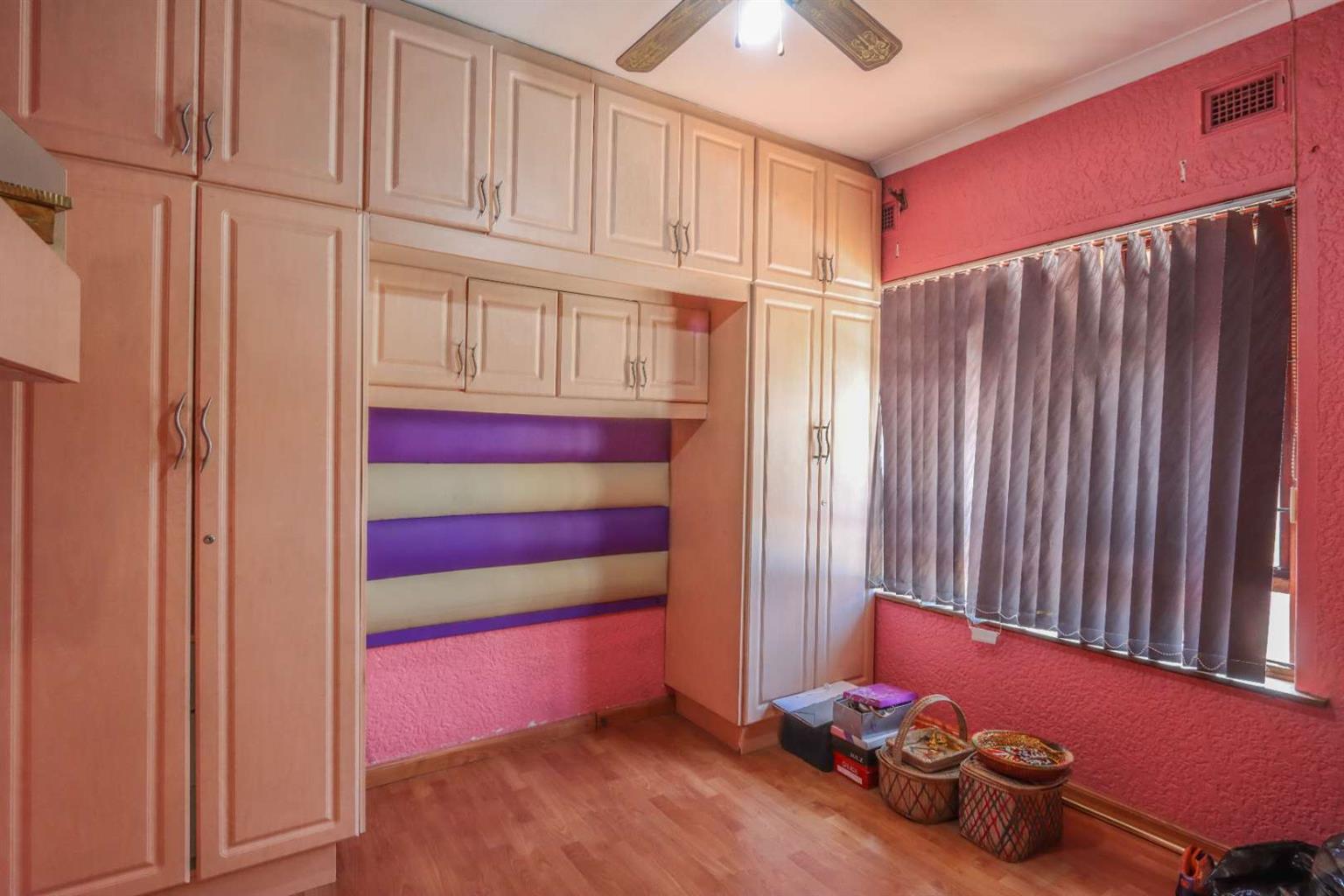 3rd bedroom built-in cupboards and ceiling fan.