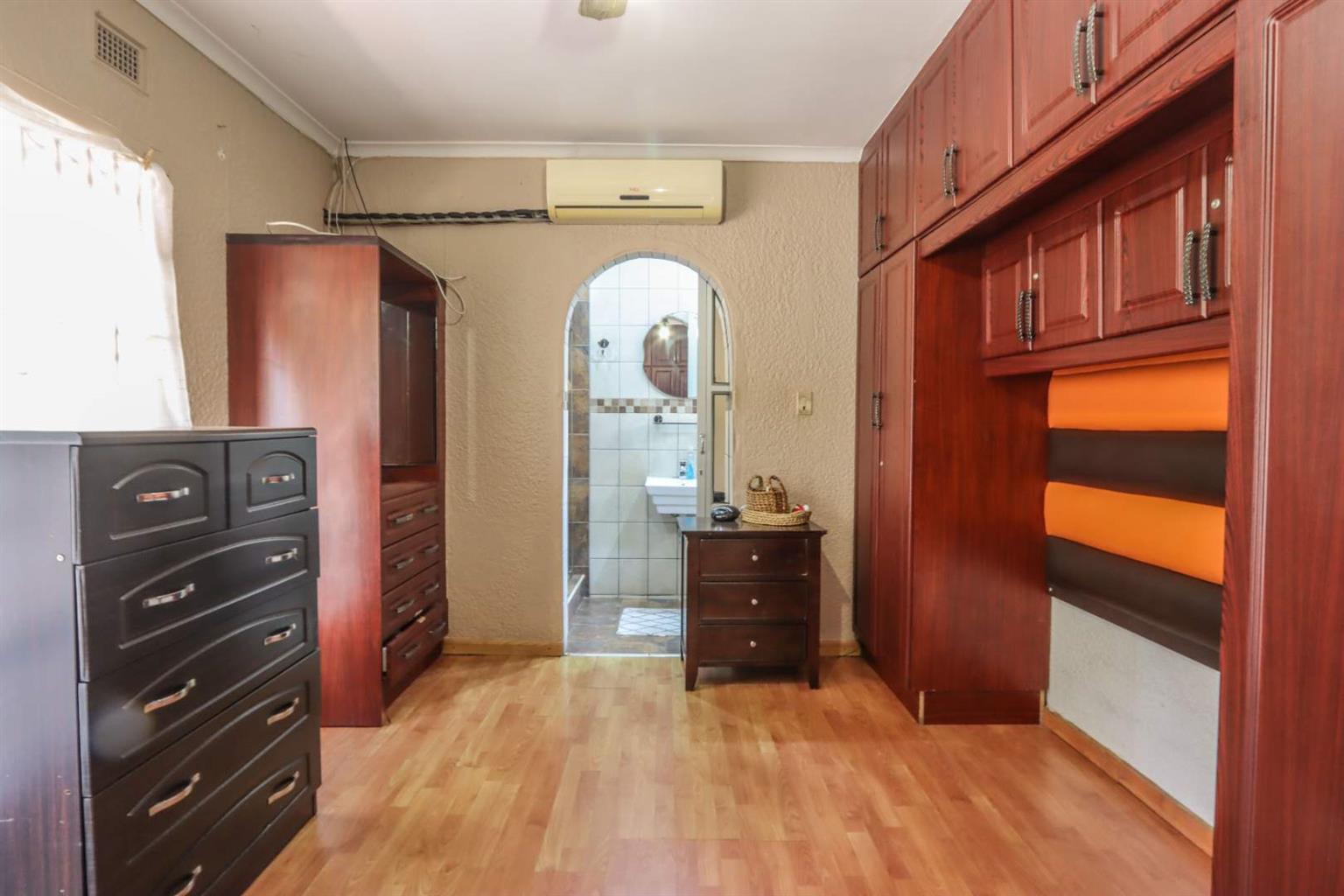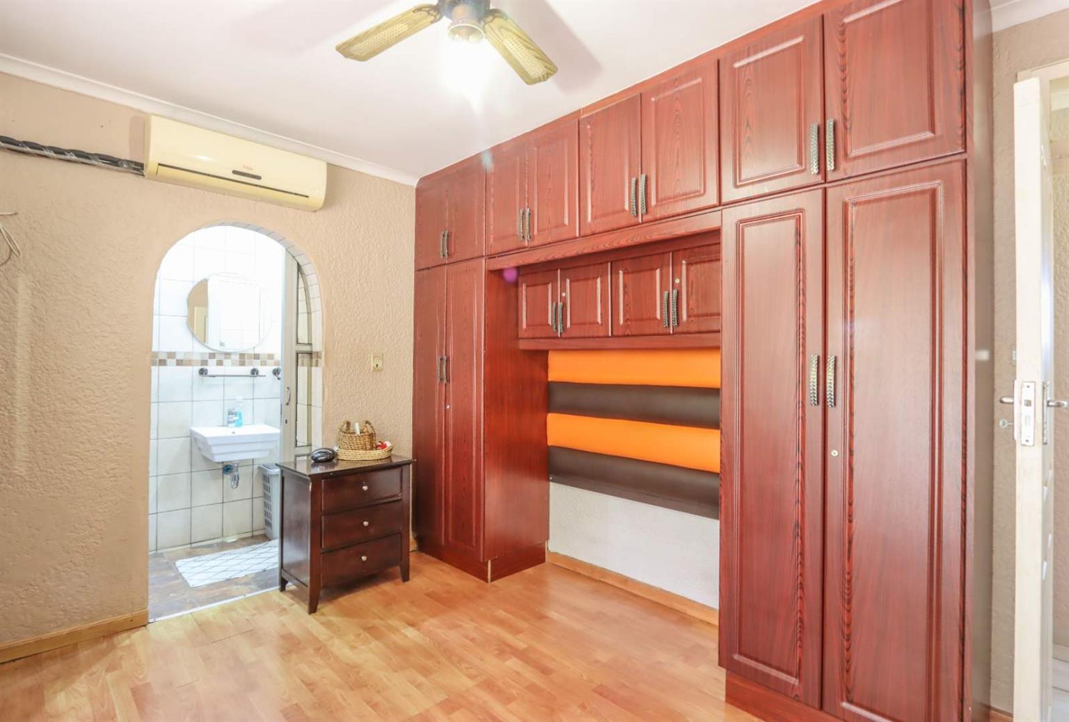 4th bedroom built-in cupboards, ceiling fan, aircon, and en suite shower & toilet.