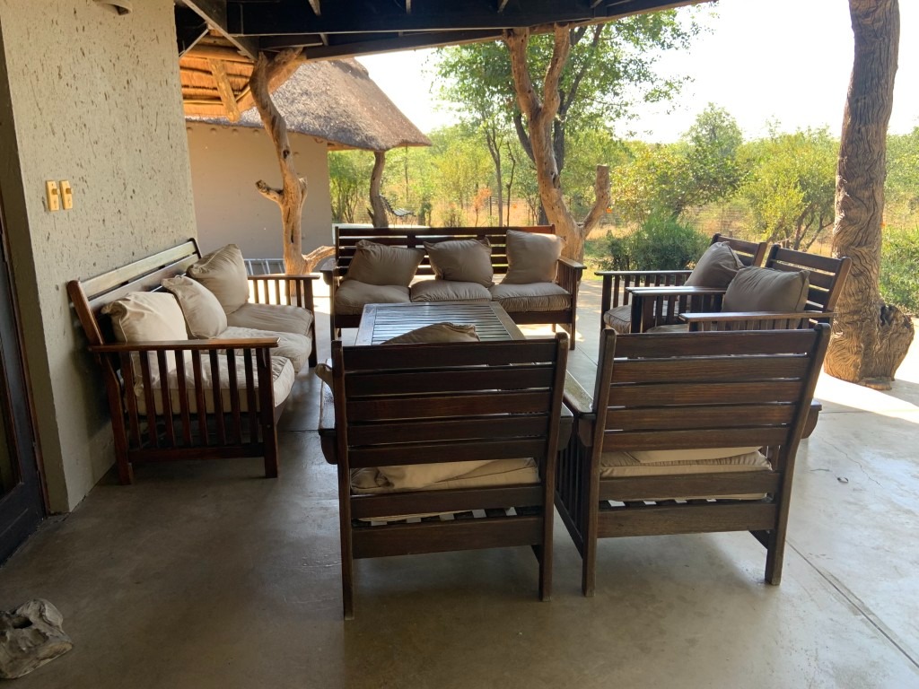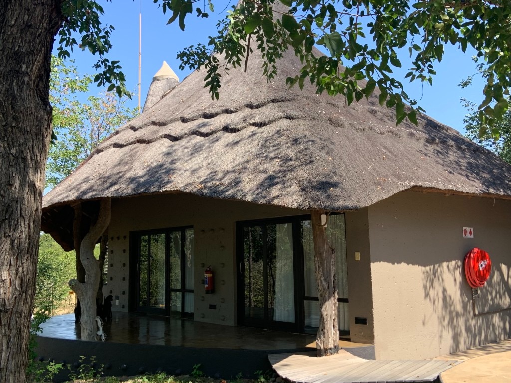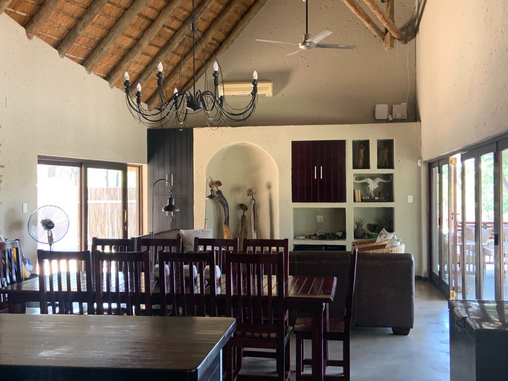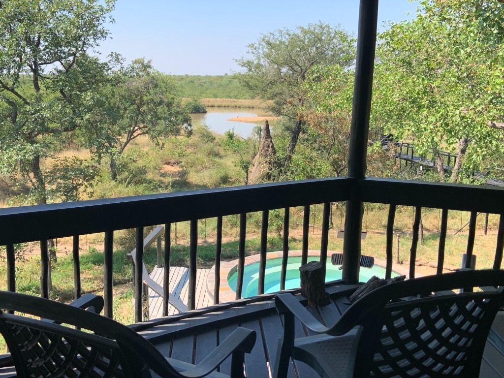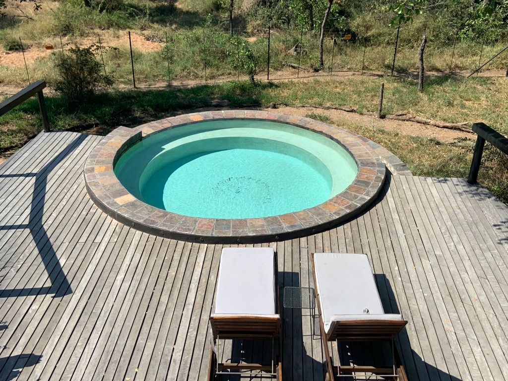 There are five en-suite bedrooms and a living area, which are all air-conditioned. These open onto expansive shaded verandas with wide overhang thatch roofs. A wooden deck leads off the lounge veranda to a circular rim-flow pool with views of the waterhole and Kruger Park beyond.