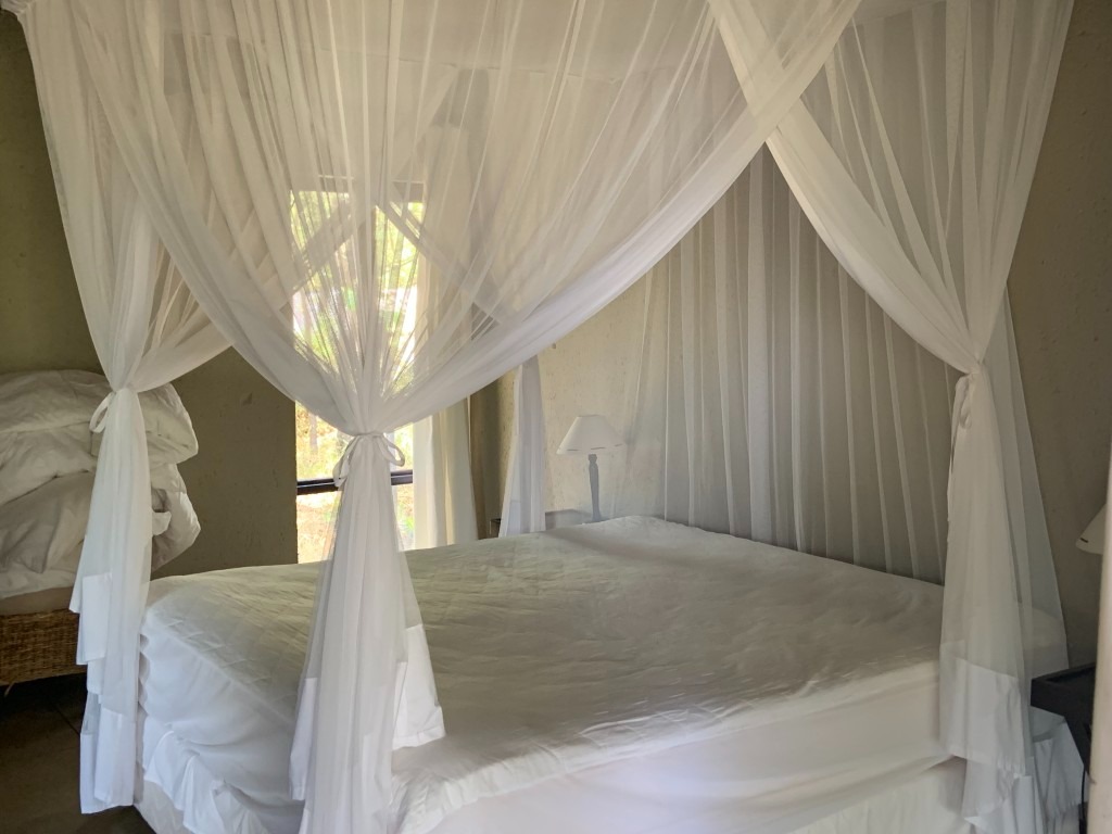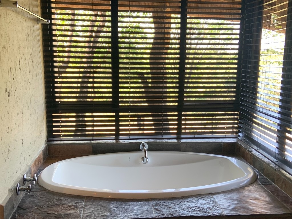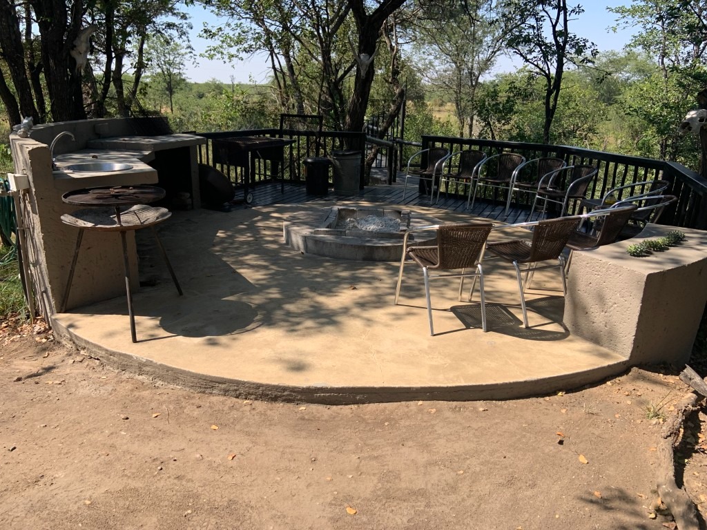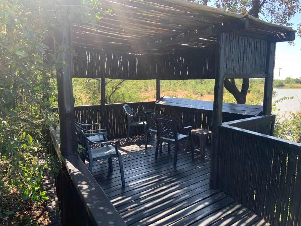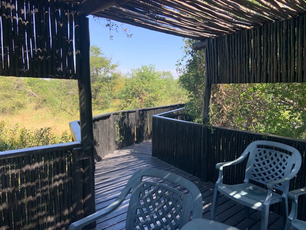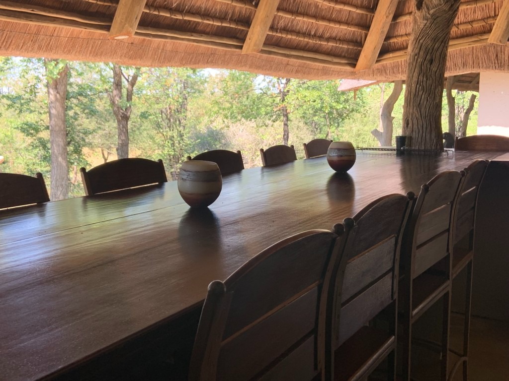 There are five en-suite bedrooms and a living area, which are all air-conditioned. These open onto expansive shaded verandas with wide overhang thatch roofs. A wooden deck leads off the lounge veranda to a circular rim-flow pool with views of the waterhole and Kruger Park beyond.