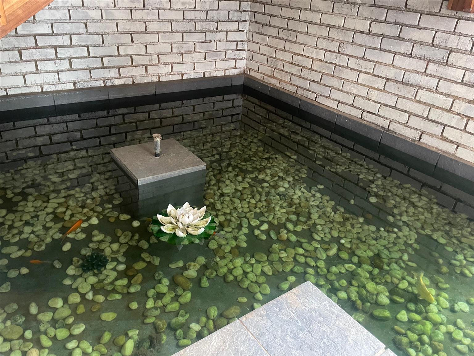 A welcoming reception lounge featuring a built-in fish pond, setting a tranquil tone from the moment you step inside.