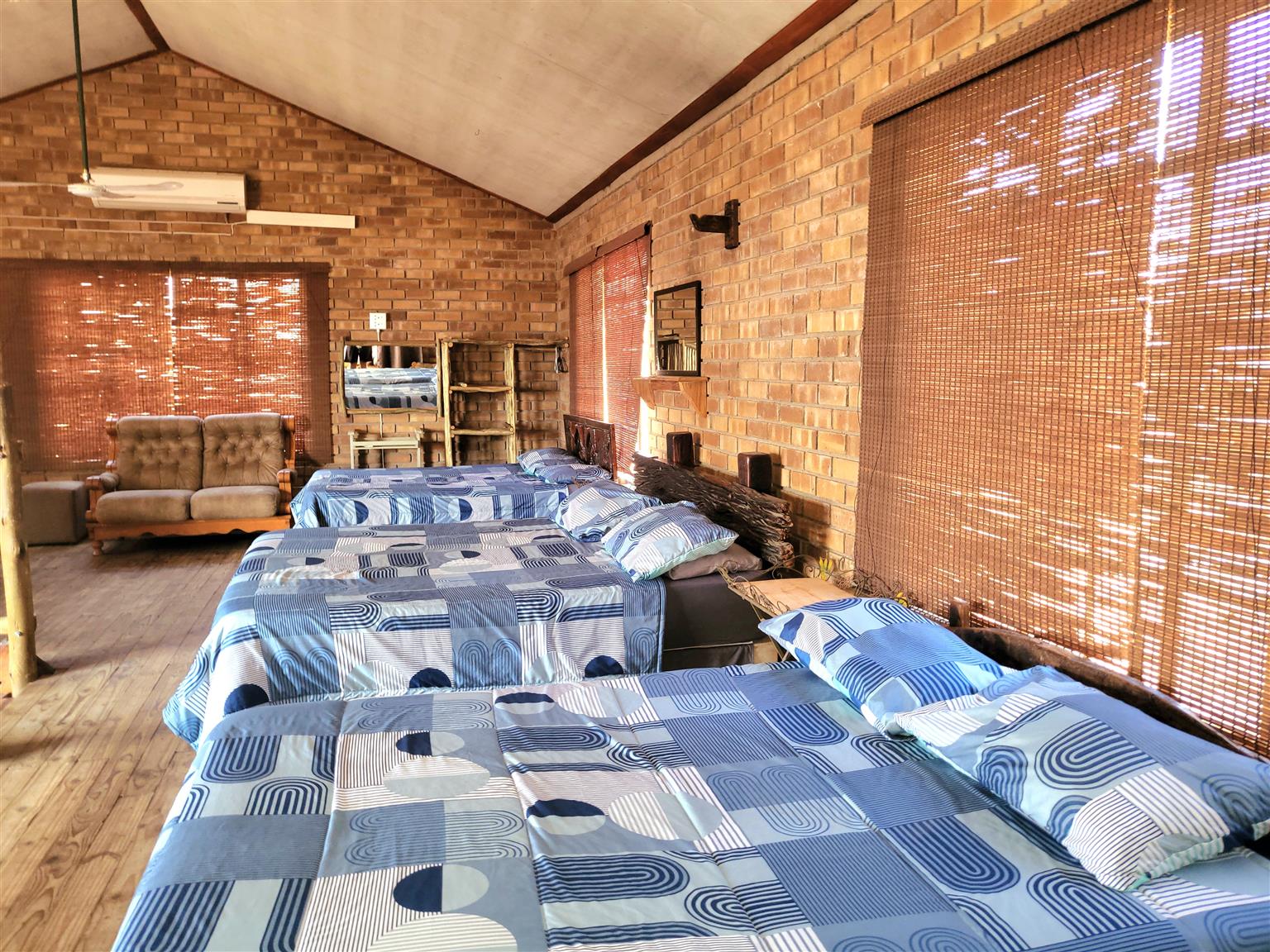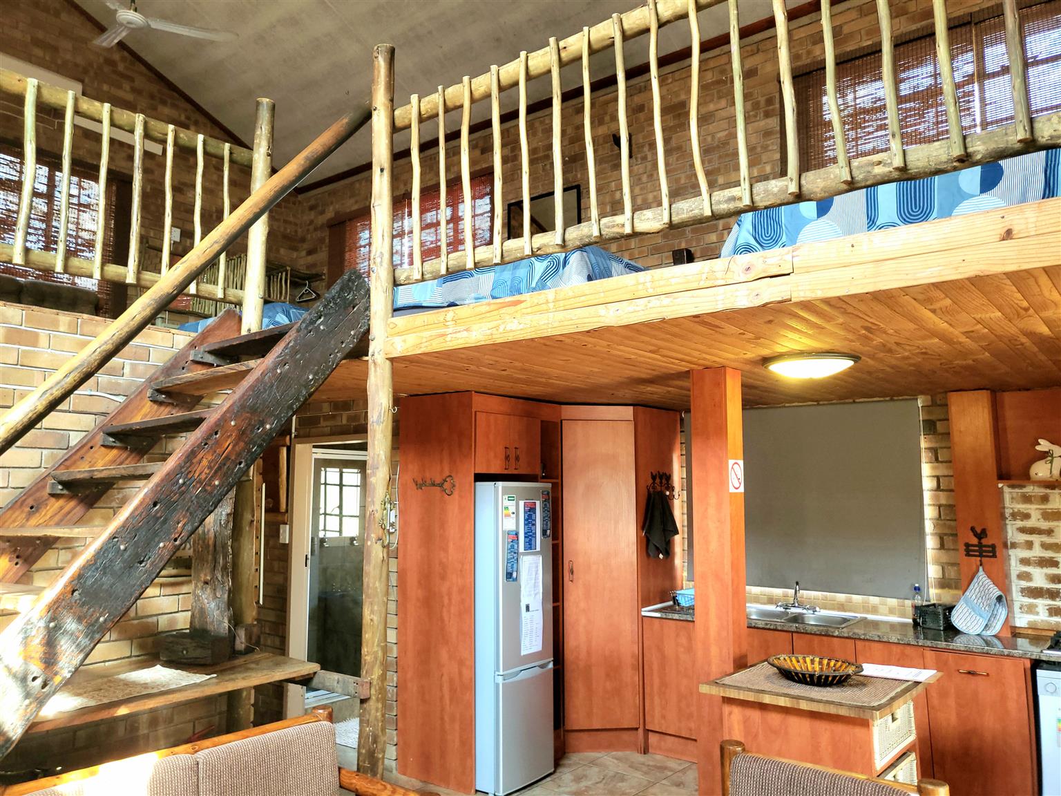Head upstairs to discover a spacious loft area, ideal for accommodating friends and extended family in comfort. This area leads to a beautifully designed main bedroom with a cozy log cabin aesthetic, complete with its own sitting area where you can unwind with a good book or relax after a sun-soaked day.