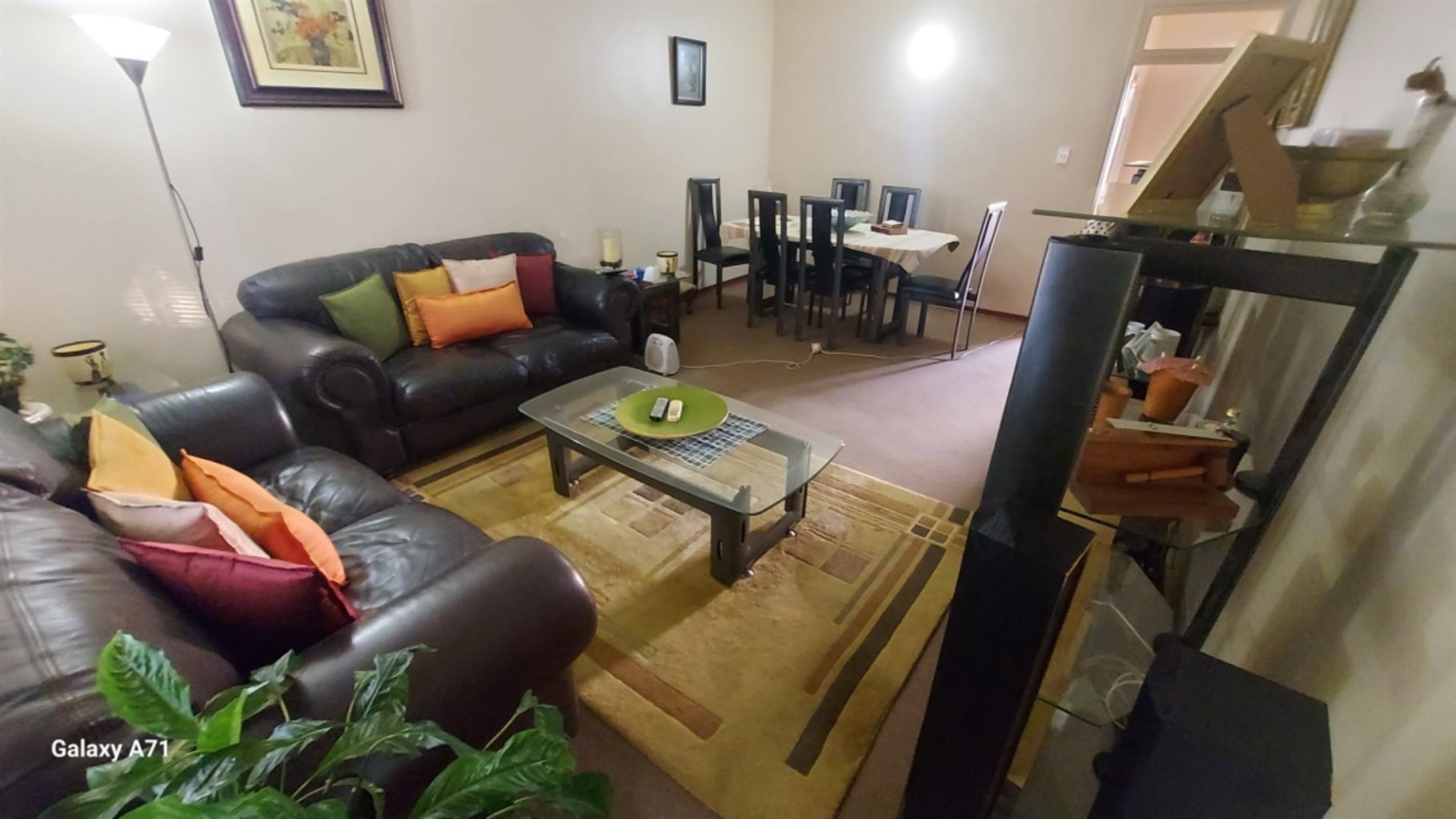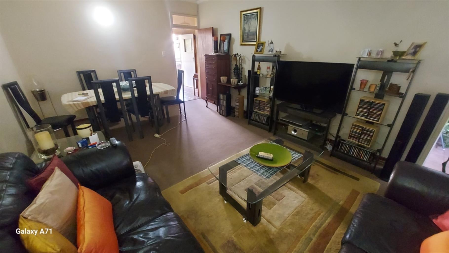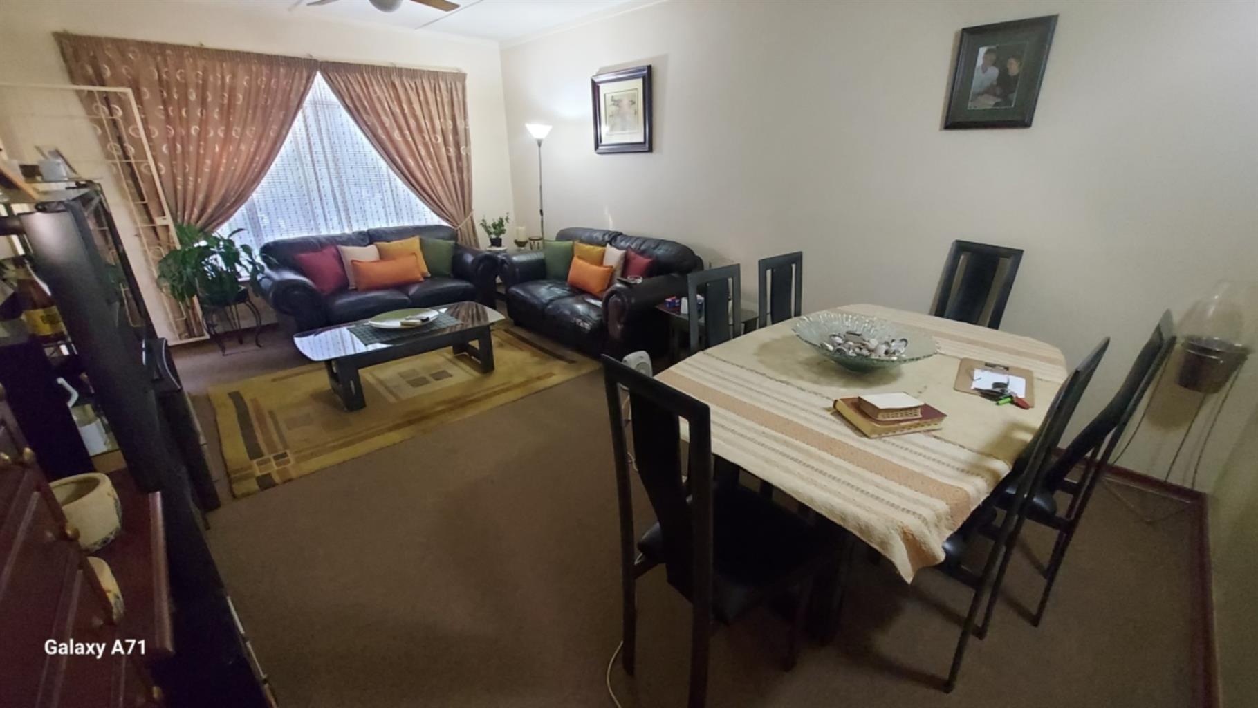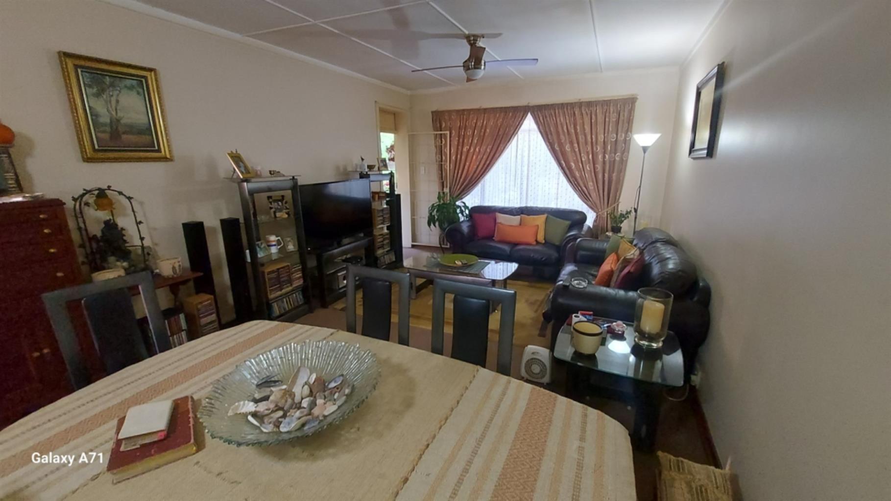 The lounge has a ceiling fan to keep the occupants comfortable. There are blinds on the windows and burglar bars for safety.
