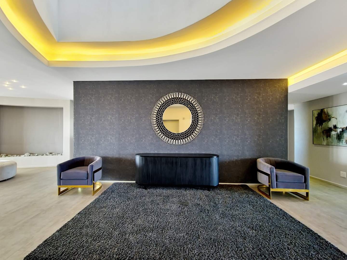 Sliding doors connects the main lounge to a large balcony facing the ocean to the north. A second lounge with a bar overlooks Table Mountain and the blue waters of the Atlantic Ocean, complete with its own balcony. A large water feature creates ambience in the main lounge.