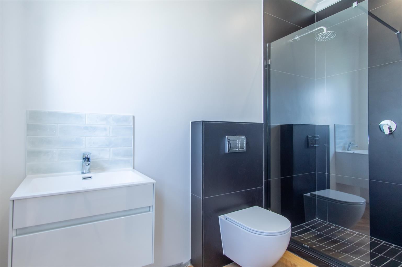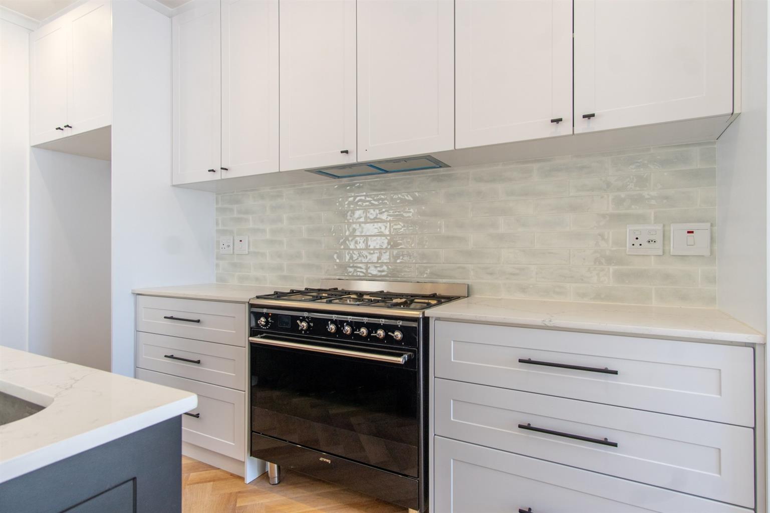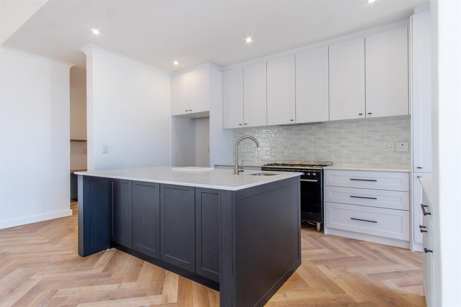 At the heart of the home is a stunning kitchen that pairs modern finishes with timeless charm. A free-standing Smeg gas stove and a central island that doubles as a breakfast nook set the tone, while the adjoining scullery keeps the space practical and uncluttered. The open-plan design flows seamlessly into the dining and living areas, where the pitched roof with exposed beams creates a sense of volume and character, making this space truly unique.