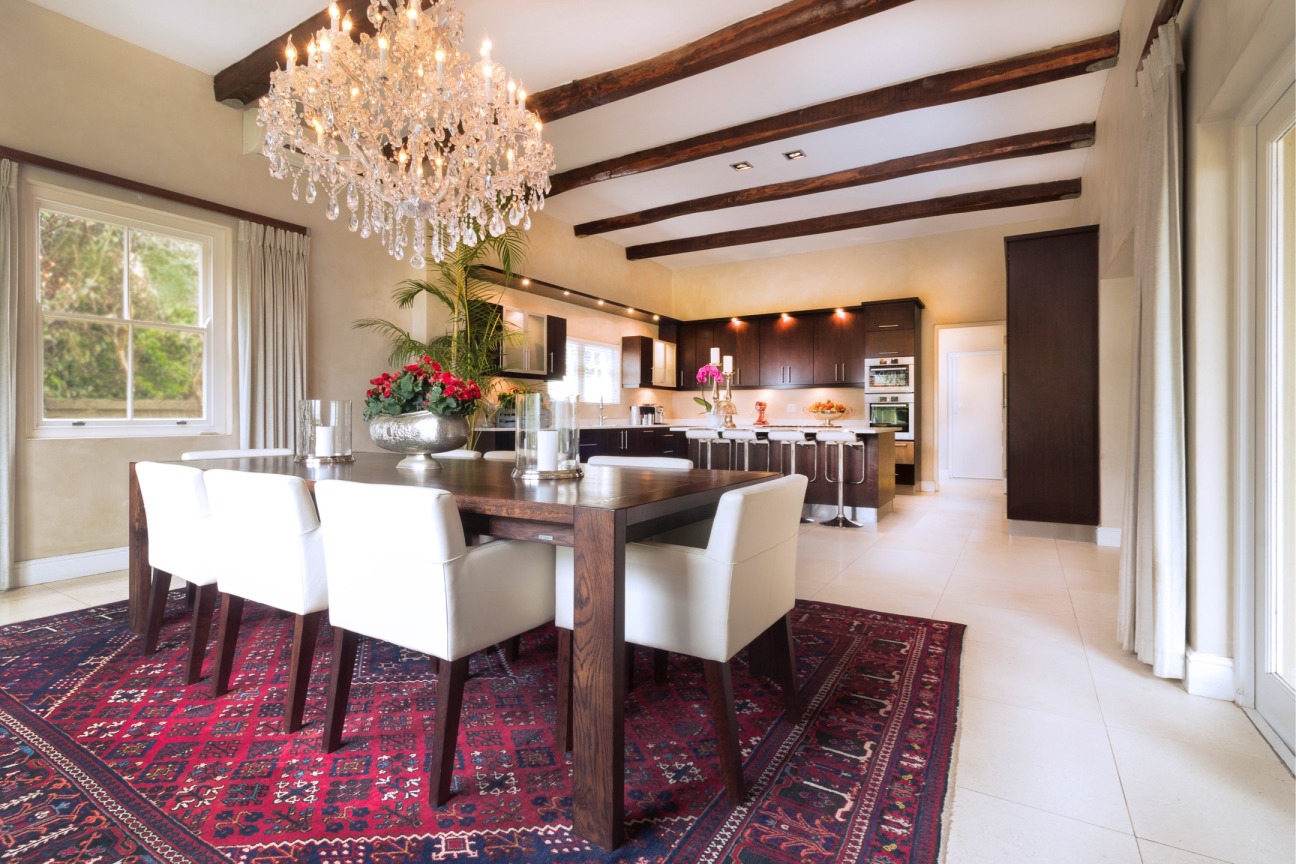 Striking double-volume kitchen and dining area, adorned with a stunning chandelier