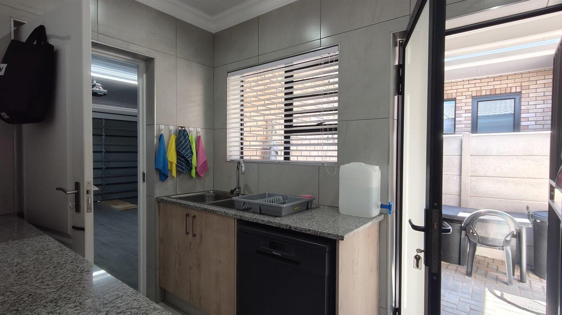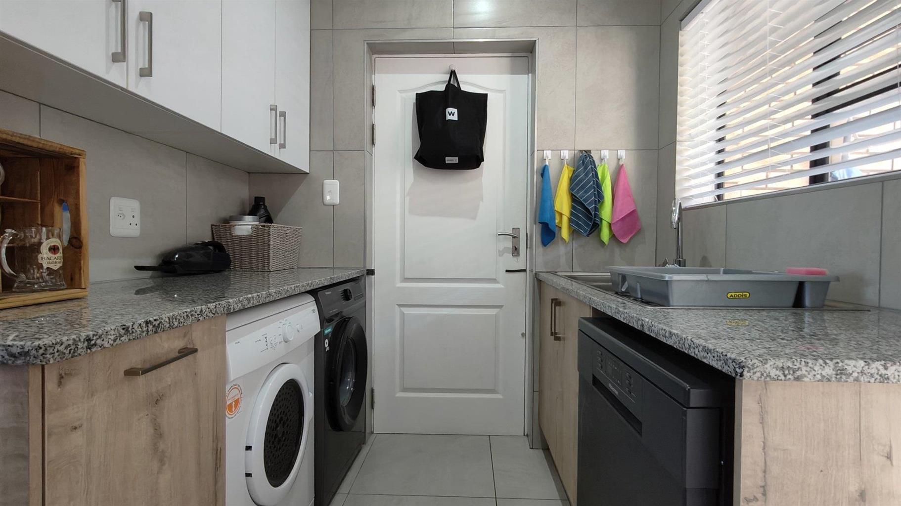 The impeccably neat kitchen is designed for functionality, complemented by a separate scullery room that keeps things tidy and provides easy access to both the double garage and a private courtyard area complete with clotheslines. The property also offers guest parking and a lovely small garden, adding a touch of greenery to your everyday life. This home comes with an added bonusa Wendy house included in the sale, providing extra storage space for garden equipment or tools.