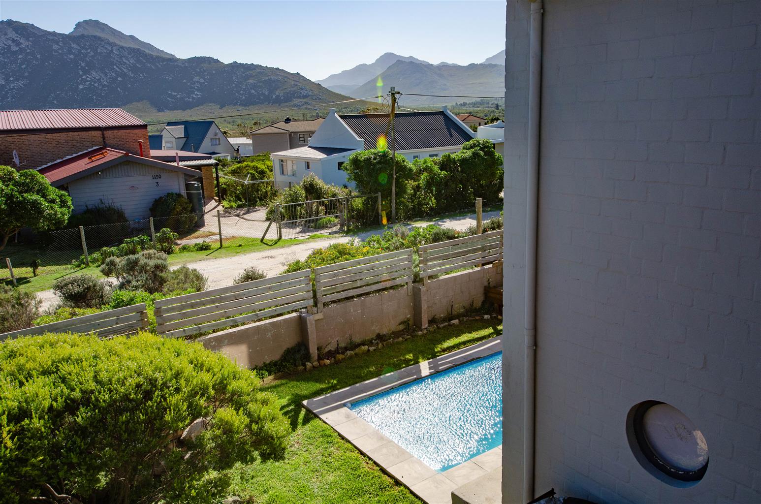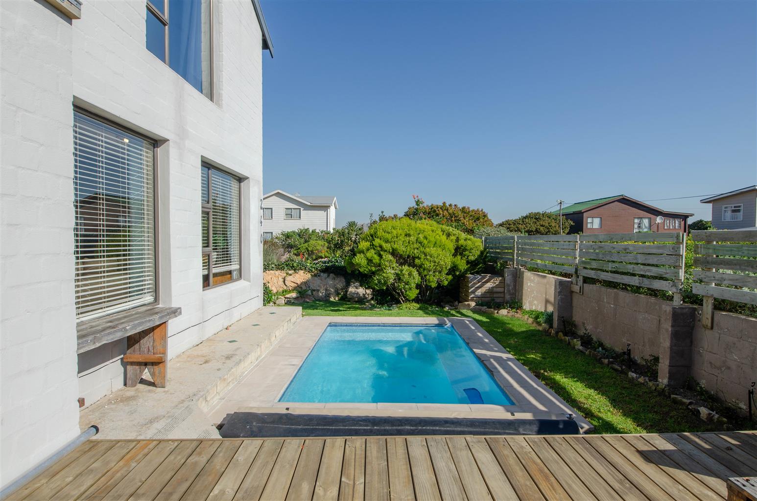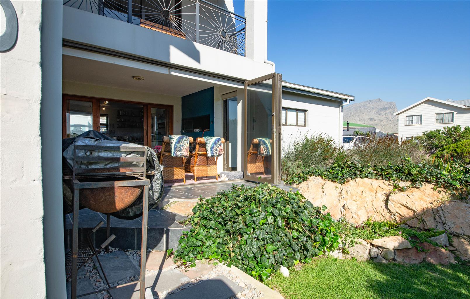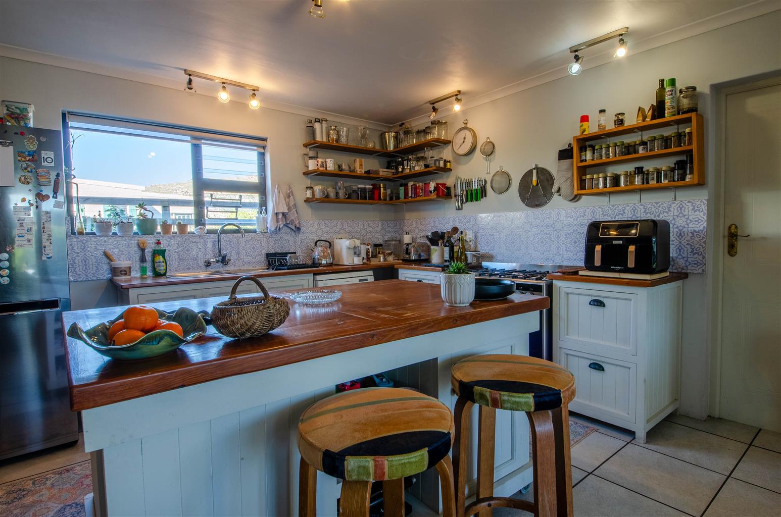 Inside, the open-plan living area flows into a dining room and practical, character-filled kitchen. The kitchen is equipped with a gas hob and oven (included in the sale), and it connects directly to the spacious double garage with automated doors. Downstairs, you'll find two generous bedrooms (one en-suite), and a second separate bathroom. The built-in braai on the veranda is both practical and inviting — because in Pringle Bay, swimming, socialising and sizzling over the coals really do happen in the same breath.
