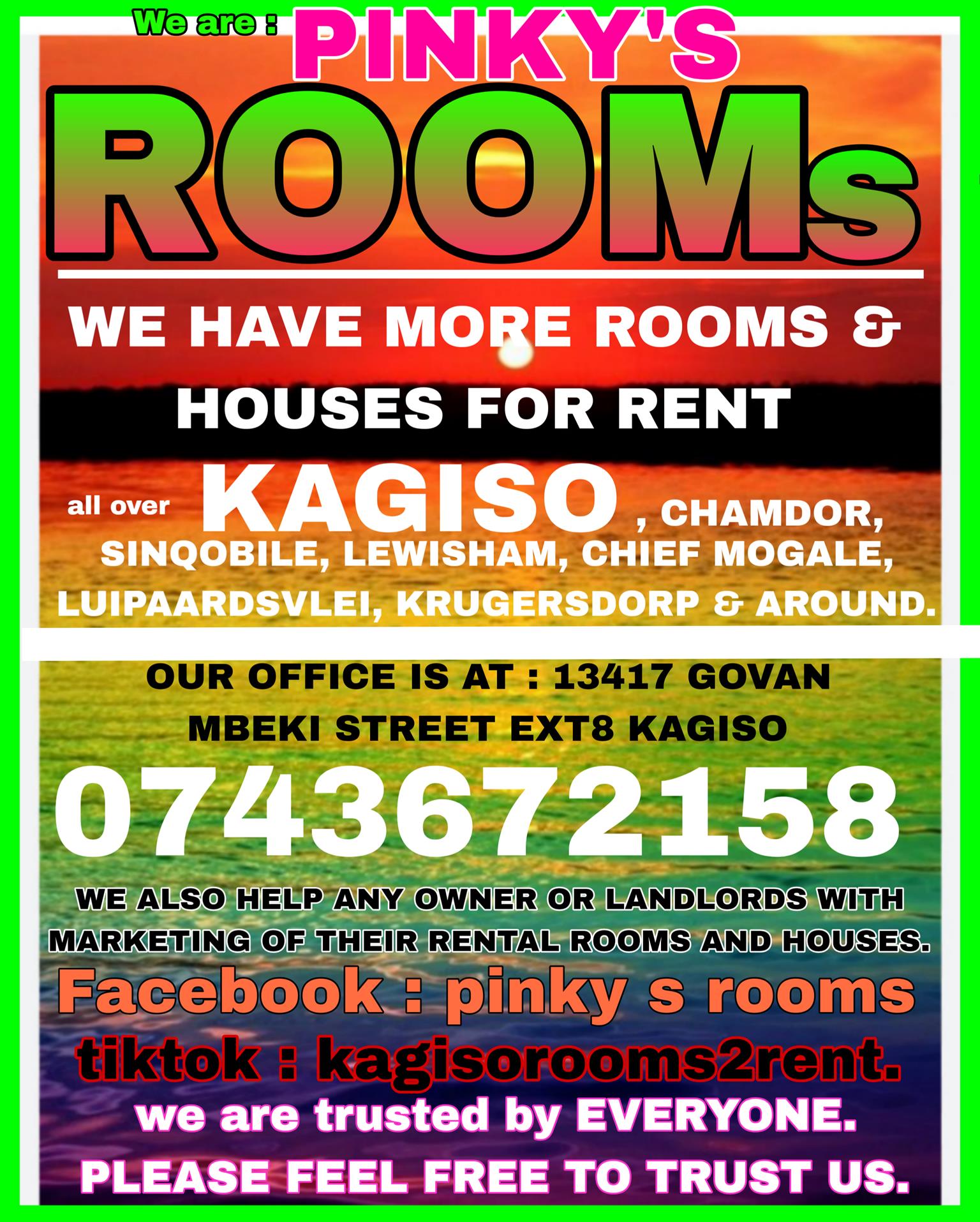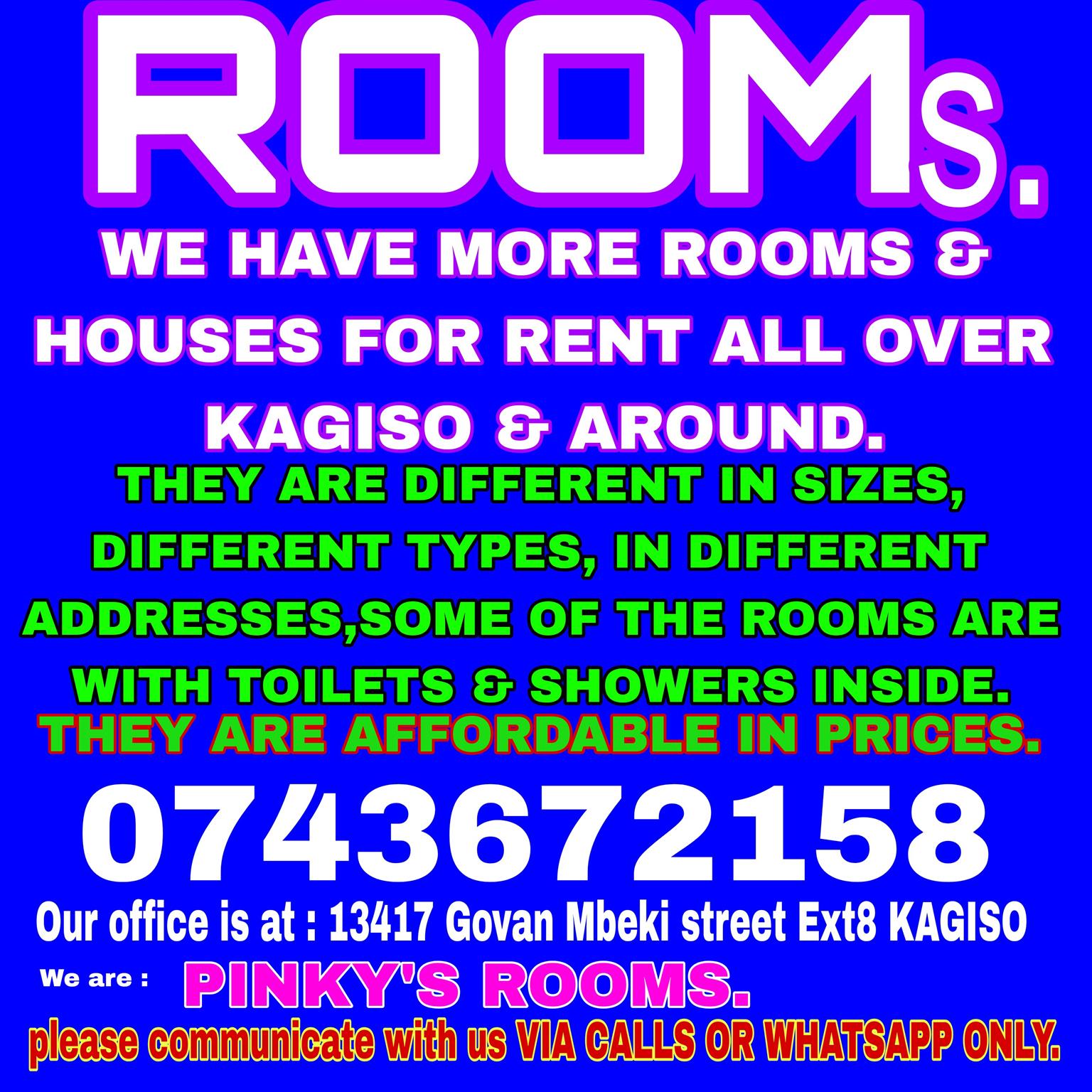 WE HAVE MORE ROOMS AND HOUSES FOR RENT ALL OVER KAGISO, KRUGERSDORP AND AROUSES