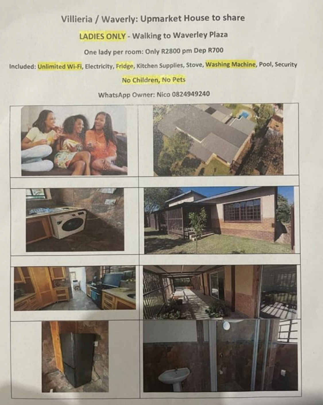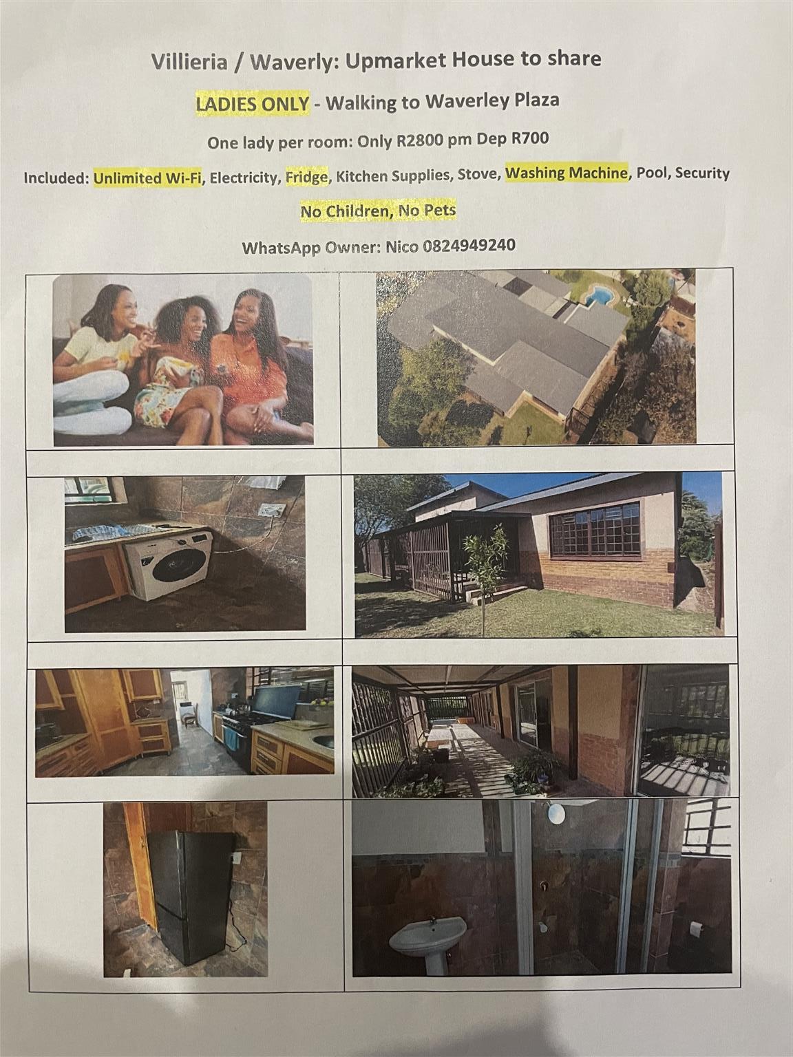Commune Waverley Pretoria Lovely room to let in Waveley / Vilieria. At the back of Waverley Plaza. Only LADIES Wifi Gas water included Electricity in bathrooms and Kitchen included. Gas stove and Fridge