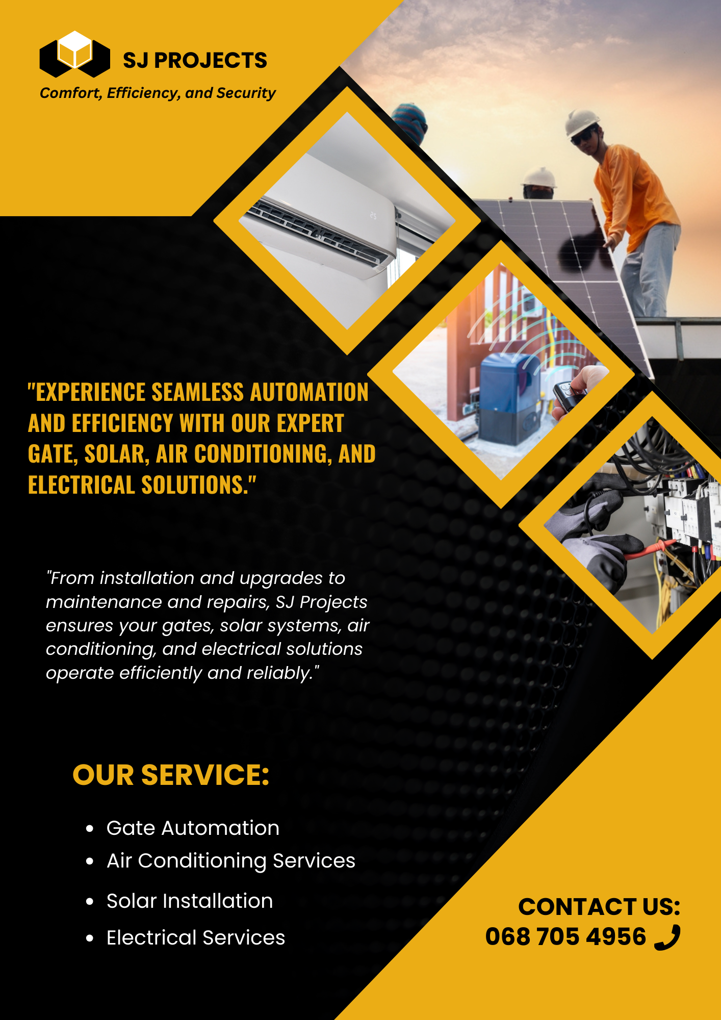 Gate Automation, Air conditioning, Electrical, CCTV and Solar Installation . More details: