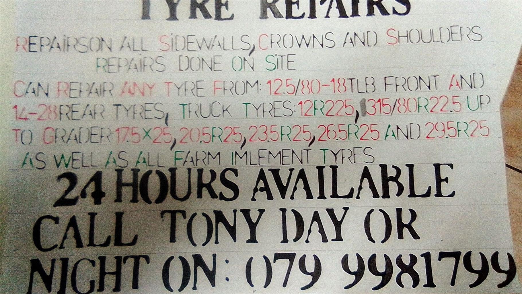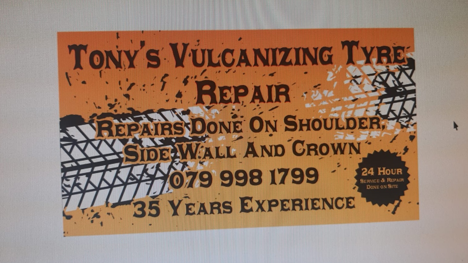 Tony's OTR Vulcanizing tyre repair. Repairs done on site. 24 hour repairs done. Call me night or day. No tyre to big or to small I can repair them all. I am based in Deneysville but are willing to travel to you.