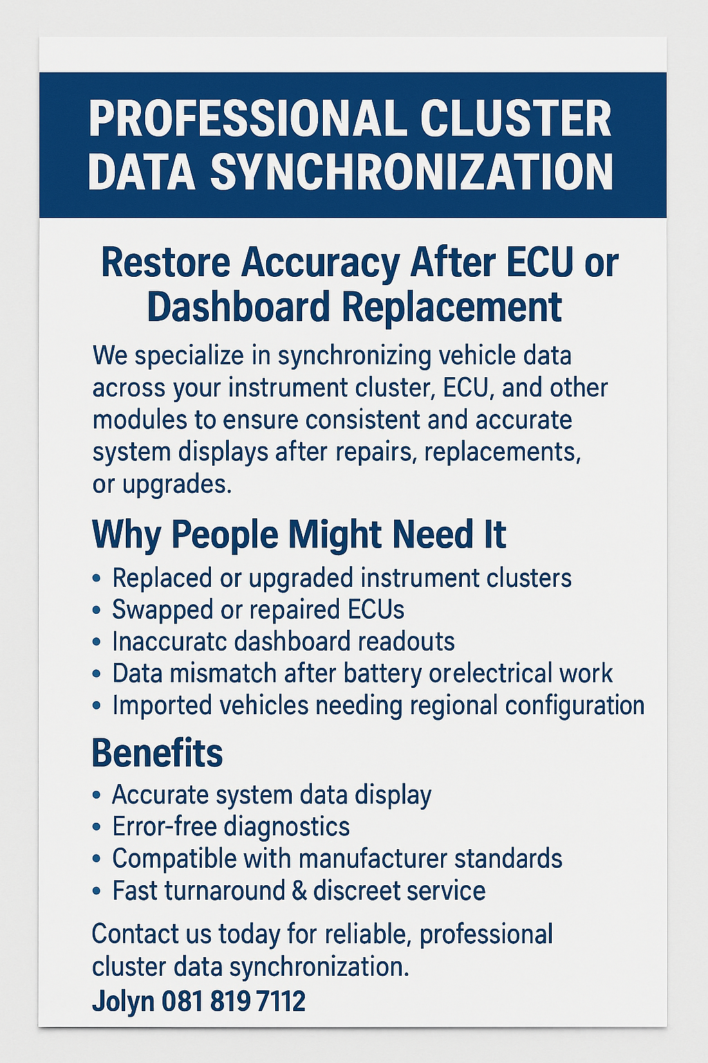 We specialize in synchronizing vehicle data across your instrument cluster, ECU, and other modules to ensure consistent and accurate system displays after repairs, replacements, or upgrades.