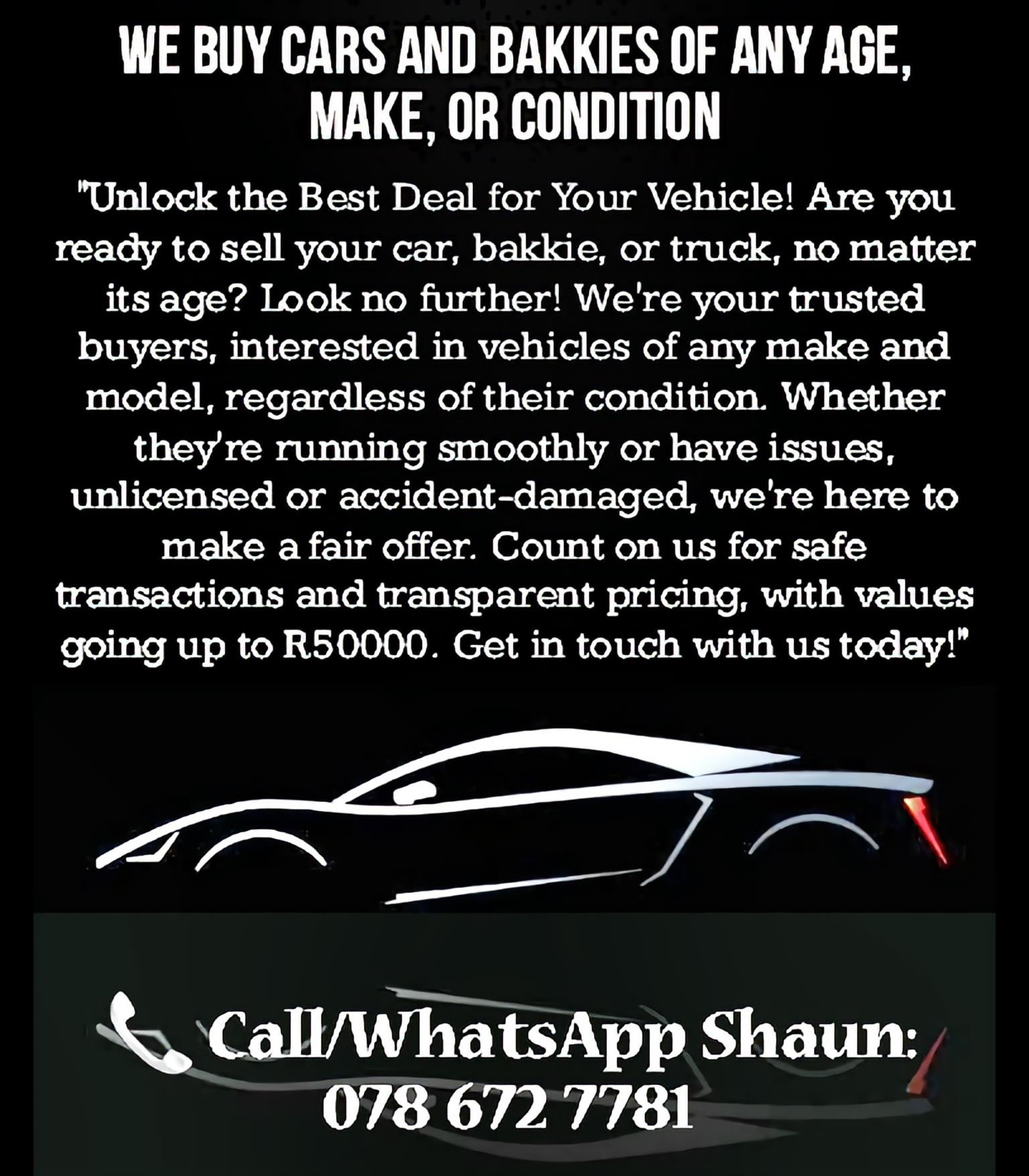 Unlock the Best Deal for Your Vehicle! Ready to part ways with your any age car, bakkie, or truck? Look no further! We're your go-to buyers, interested in any model vehicles of all conditions. From smooth runners to those with issues, from unlicensed to accident-damaged, we're here to buy. Receive top and honest prices, with values reaching up to R50000. Connect with Shaun for a transparent and rewarding transaction. Spotters commission paid for referals up to R1000 only on deals that are concluded. Call/WhatsApp: 078 672 7781view more