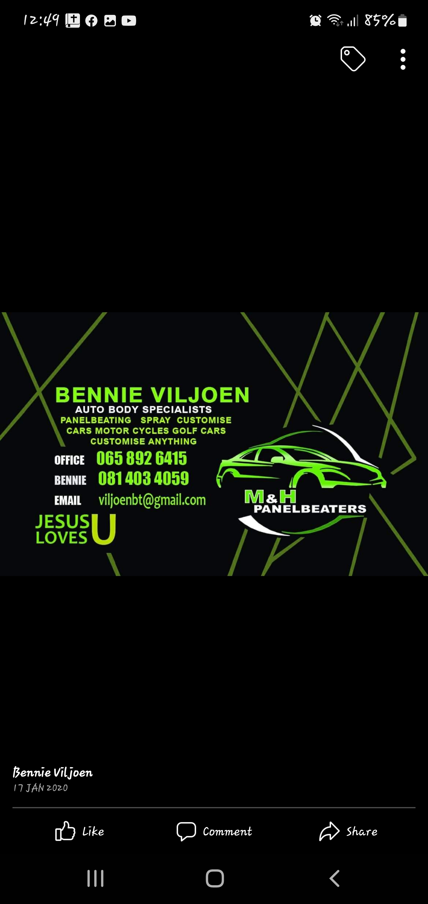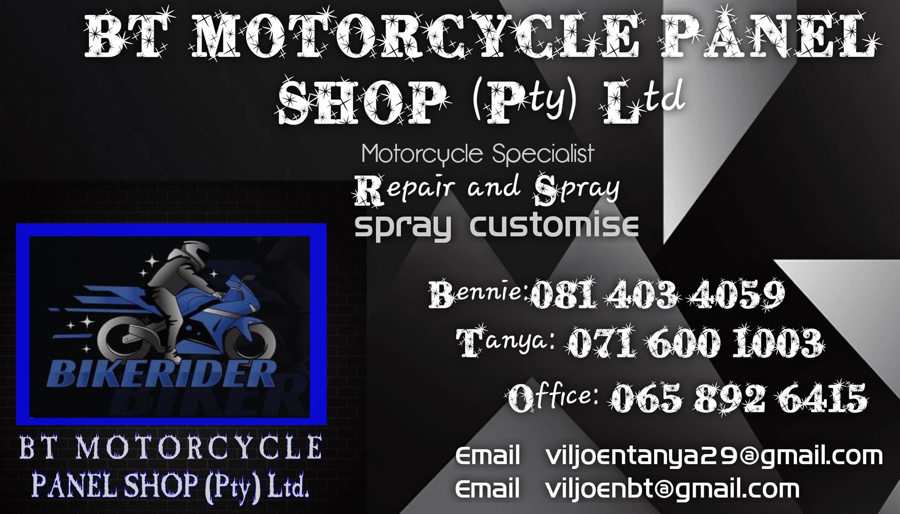 We are a company that already did panelbeating on vehicles, trucks and trailers for 8 years M & H Panelbeating and now we opened a seperate company BT Motorcycle panel shop. We do Repair and spray we can get part if necessary as wel, please take note that we do not sell part but can get prices if we are busy working on your vehicle or motorcycle.we can do custome work as well