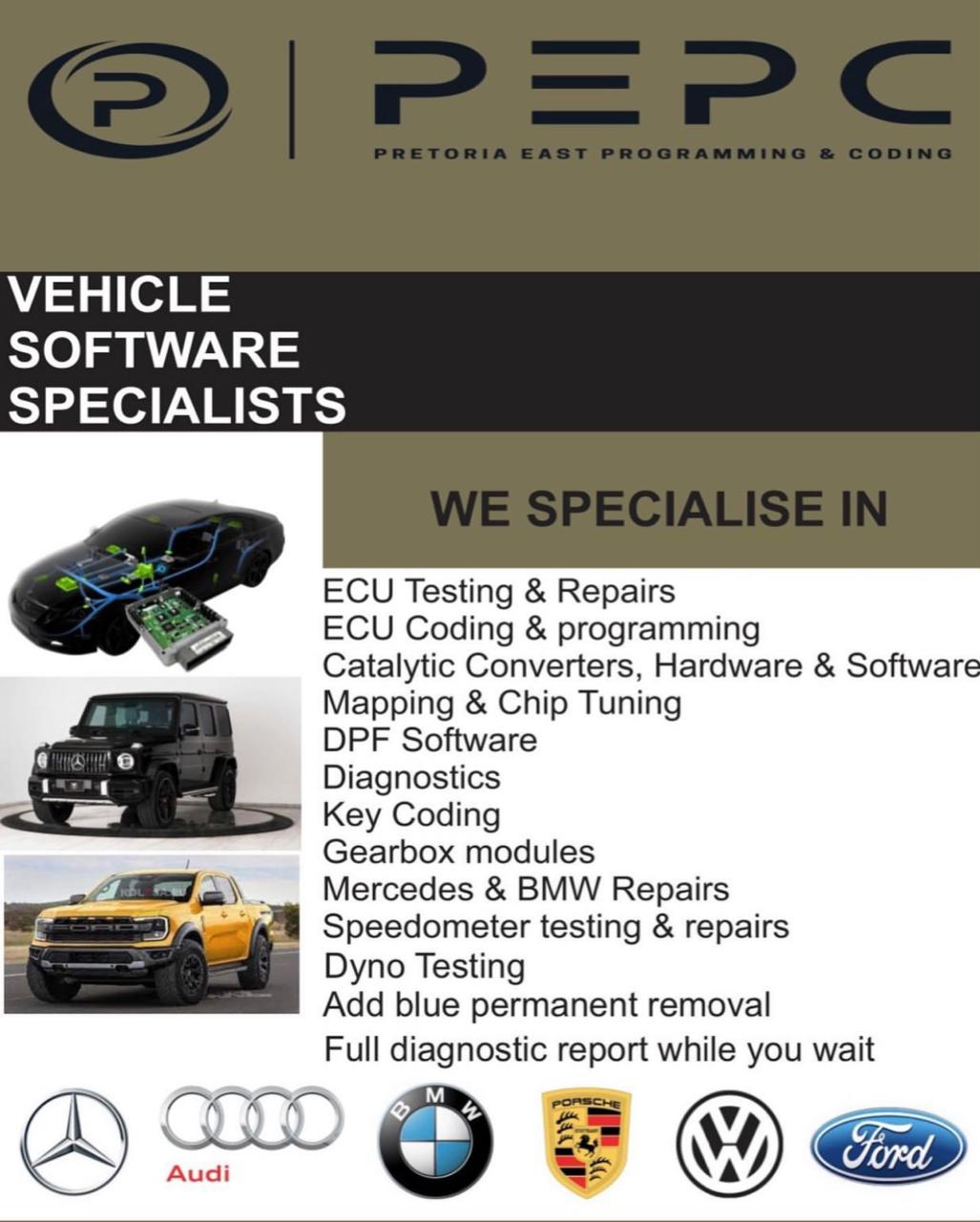 We specialize in vehicle software, diagnostics and ECU repairs. Offering the following services : ECU Programming, Chiptuning, Catalytic Converters, Mercedes Benz Specialists, Keycoding, Auto Electrical, Ad Blue Removal, Immobolizer Problems.
