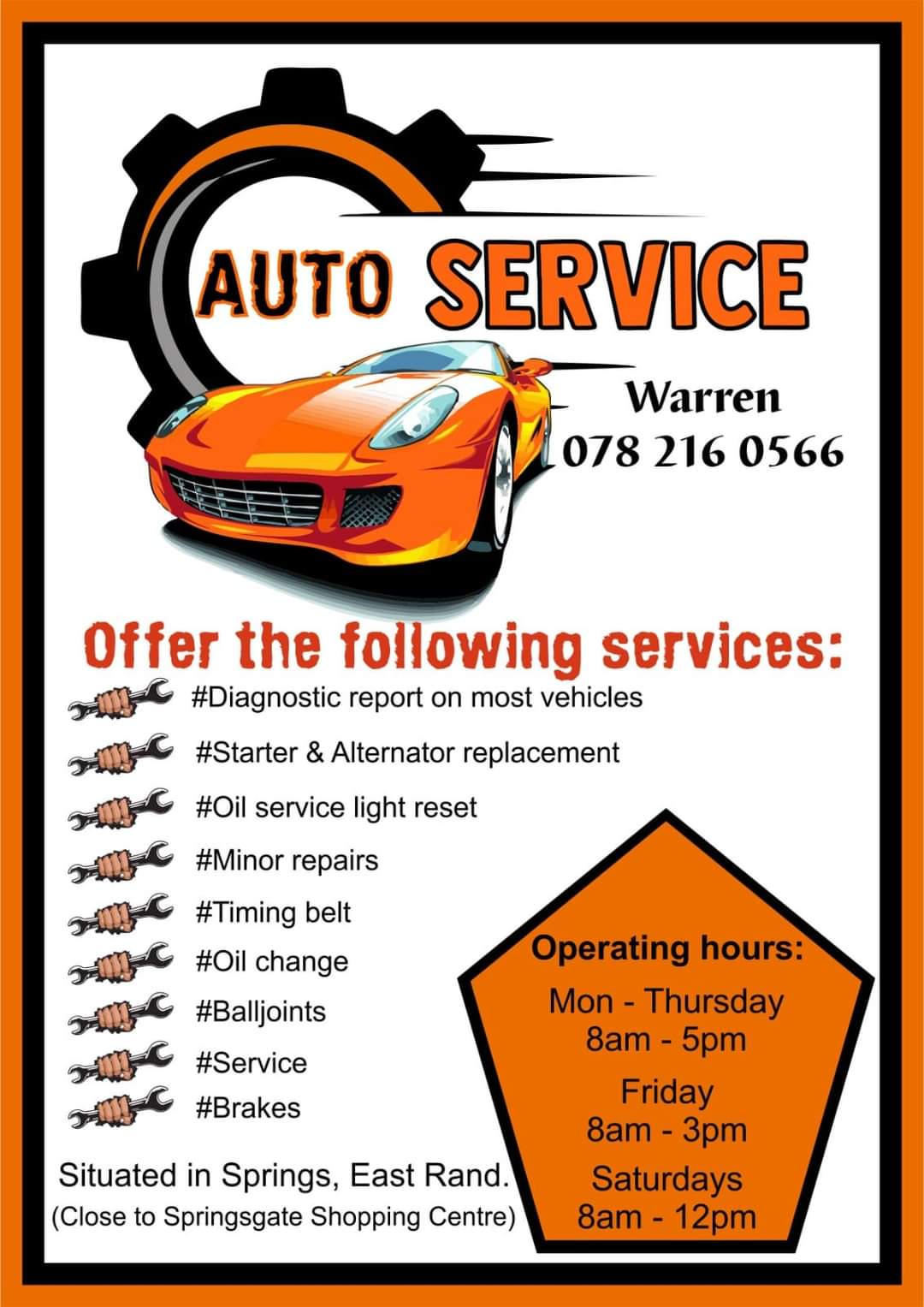 Are you in need of a reliable mechanic with competitive prices whom you can trust to fix your car in tip top condition, then look no further. With more than 15 years car repair experience and a high and loyal customer basis, you can rely on him to get the job done. Please refer to the ad for more details