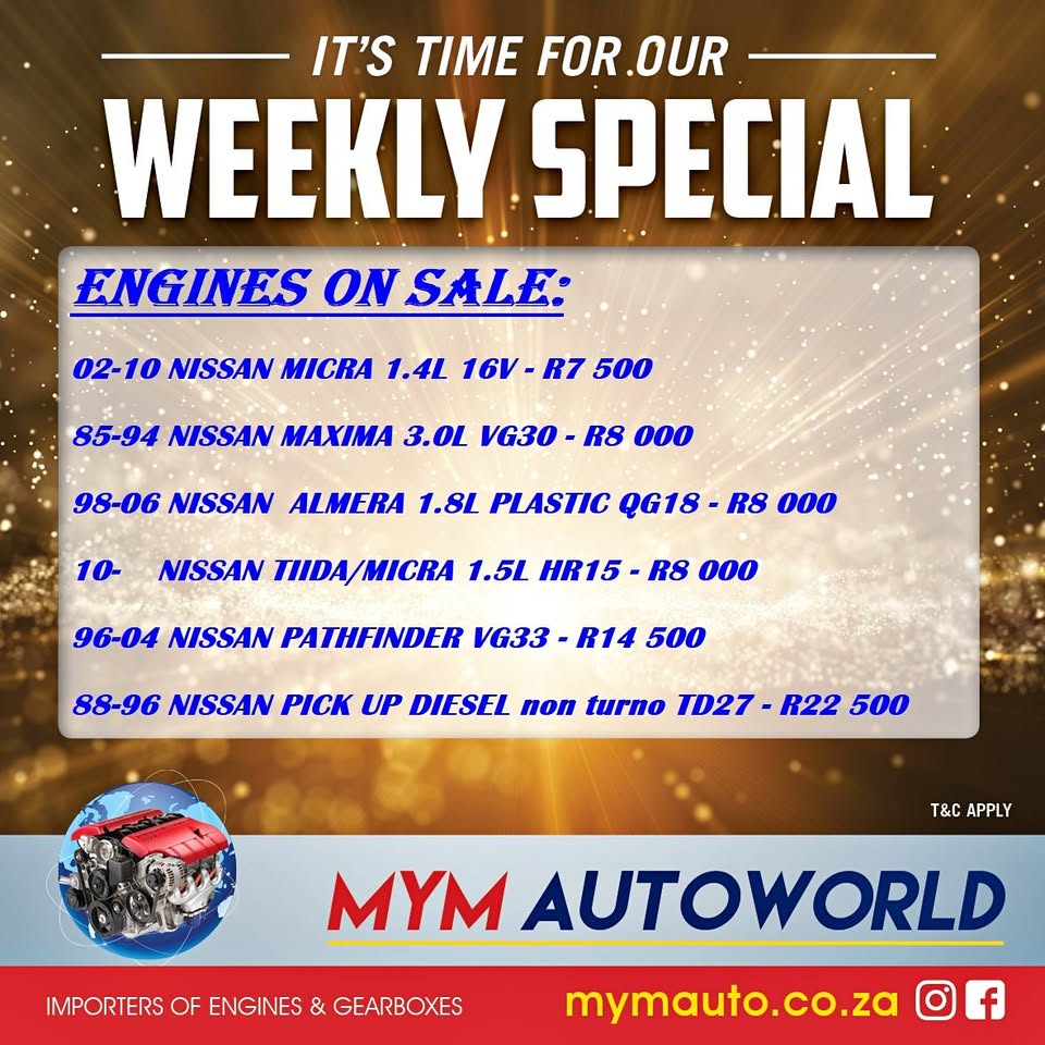 CONTACT CHAD [hidden information] MYM AUTOWORLD ALRODE ALBERTON: 2 BOSWORTH STREET ALRODE ALBERTON *Payments via EFT and speed Point No Cash on premises *Verify account number before making payment *Pictures for illustration purposes only *We arrange country wide deliveries * OVER 10 000 ENGINES & GEARBOXES AVAILABLE We Are The Largest Importers Of Second Hand Engines And Gearboxes In South Africa. We Are Stockiest Of The Following Brands: Alfa Romeo, BMW, Chevrolet, Daewoo, Honda, Hyundai, Isuzu, Kia, Land Rover, Mazda, Mercedes Benz, Nissan, Opel, Subaru, Suzuki, Toyota, Volvo, Volkswagen ,Jeep And Much More. We Take Pride In Giving You The Lowest Prices, Best Quality, Low Mileage, Wide Selection Of Secondhand Engines!!! You Can Find Us At: #Alberton: 2 Bosworth Street Alrode Alberton opposite the Licensing Department