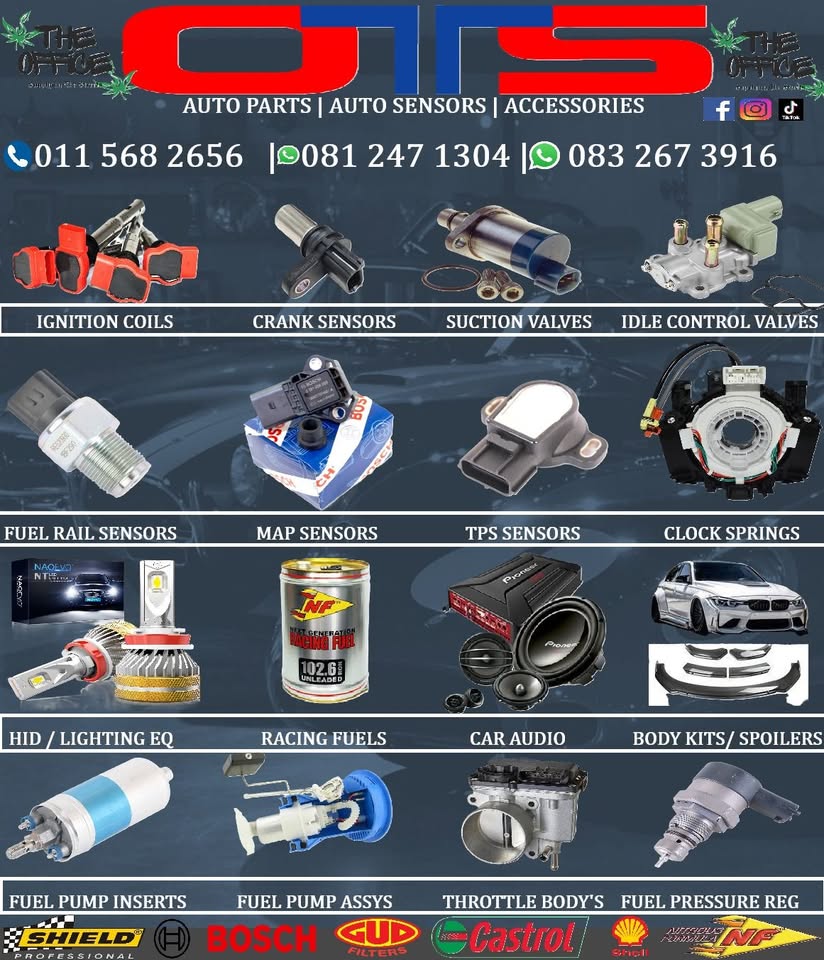 For Affordable Quality Replacement Auto Parts Sensors Accessories we got you covered Call us Today 011 568 2656view more or 081 247 1304view more Delivery Nationwide-R99 Quality Affordable Replacement Parts & Sensors Here @ OTS Auto We Gurantee you good quality Affordable Parts At the Best Posible Pricing., We are Based In JHB South Lenasia we do Offer A wide range of Quality automotive products and also Offer a Door to door Courier Delivery for more information Call Us On 011 568 2656view more Or Whatsapp 081 247 1304view more / 083 267 3916view more Quality Replacement Crankshaft Sensors & Camshafts Sensors Crank Pulleys Fuel pressure Sensors Suction control Valve Available For Most Vehicle Types And Models SA's #No1 Automotive Vehicle Sensor Supplier .If We Dont Have It We Will Find It For You .😉 #cranksensors #camsensors #clocksprings #fuelinjectors #suctioncontrolvalves #airflowmeter #partsonline #spareshops #motorsport #otsautosensors OTS AUTO SENSORS N SPARES SPECIALIST’S Call Us Today We Deliver Nationwide – Door to Door Buy All Parts & Sensors for all different vehicles types . If you can't find it here, we will source it for you. At OTS AUTO We believe in Quality Affordable Replacement Parts & Auto Electrical Sensors & We Are Wholesalers & Distributors to the market of high-quality parts for all vehicle manufacturer types OT’S AUTO SENSORS N SPARES is distributor of all Automotive sensors and auto electrical components & has been in the industry for more than 10 years with experience and profession We do stock the following items • ABS Speed Sensor • Accelerator Pedal Sensors • Air flow meter sensors • Air temperature sensors • Block Breather • Brake Wear Sensors • Camshaft Sensors • Crankshaft sensors • DSC Pressure Sensors • Expansion Tank sensors • Intake Manifold Pressure Sensor • Knock Sensors • Lambda Sensors • Low Pressure Fuel Sensors • Map Sensors • Oil Timing Control Valve • Power steering Pressure Switch • Speed Sensors • Tps Sensors • Turbo Pressure Regulator Valves • Valve Tronic Motor Actuator • Auxiliary Water Pumps • Automatic Gearbox Solenoid Valves • Diff Pressure Sensors • EGR Valves • FPVR Valves • Injectors • Fuel rail sensors (common Rail sensor) • Fuel Pressure Regulators • High Pressure Fuel Pumps • Ignition Modules • Spiral Clock springs (slip rings ) • Suction control valves • Thermostats • Throttle Body’s • Vacuum Regulators • Water pumps • Wiper Blades & Arms Please Note Our Business Hours are from : Monday to Friday 8am to 5:00pm Fridays we are closed between 12pm -2pm Alfa Romeo Audi BMW CAM Chana Chevrolet Chery Chrysler CMC Citroen Daewoo Nissan Toyota Mazda Ford Ranger Vw Golf Polo Hyundai Kia