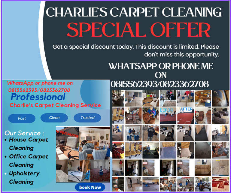 Winter Special SPECIAL!!! Hoe meer ons skoonmaak, hoe minder betaal jy. Ons doen n diep stoom skoon, maak van matrasse, matte, rusbanke, eetkamer stoele, kantoor stoele, gordyne. Ons doen ook Scotchgarde. Ons sal enige kwotasies klop. Jy kan my WhatsApp of bel by 0815562393view more/0823382708view more Vir 'n bespreking Dankie,,