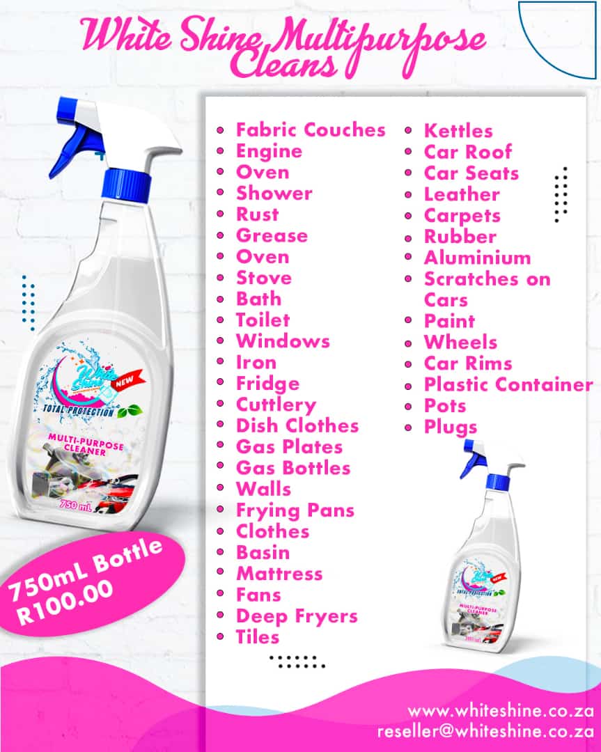 White shine multi purpose cleaner removes tough stains and grease, the magic bottle that cleans up anything you can think of in your household, keep everything spotless and shining with affordable price, if your interested to buy and sell you can also contact me