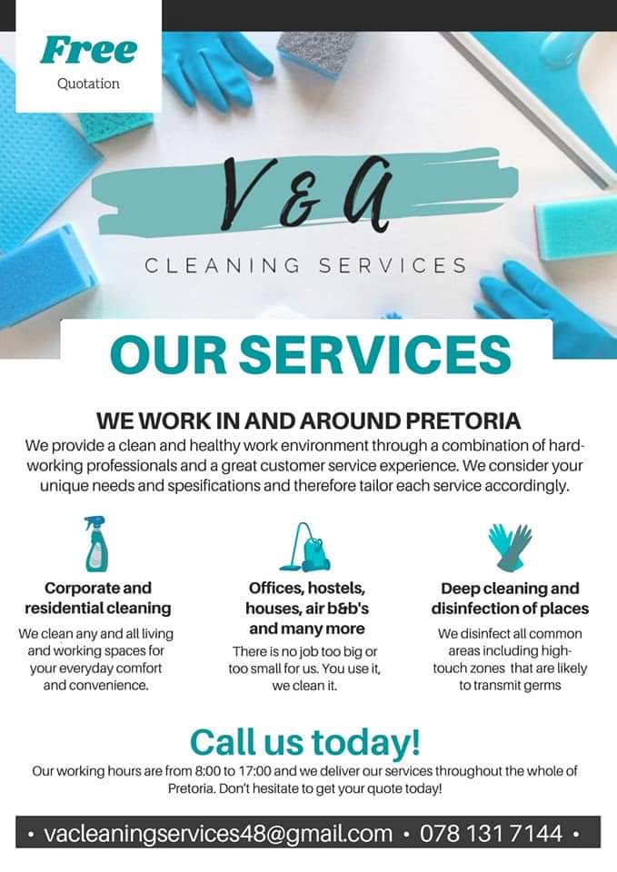 V&A Cleaning Services : We work in and around Pretoria. We specialize in Corporate and residential cleaning, Offices, hostels, houses and many more. Deep cleaning and disinfection of places. Call us today on 078 131 7144view more
