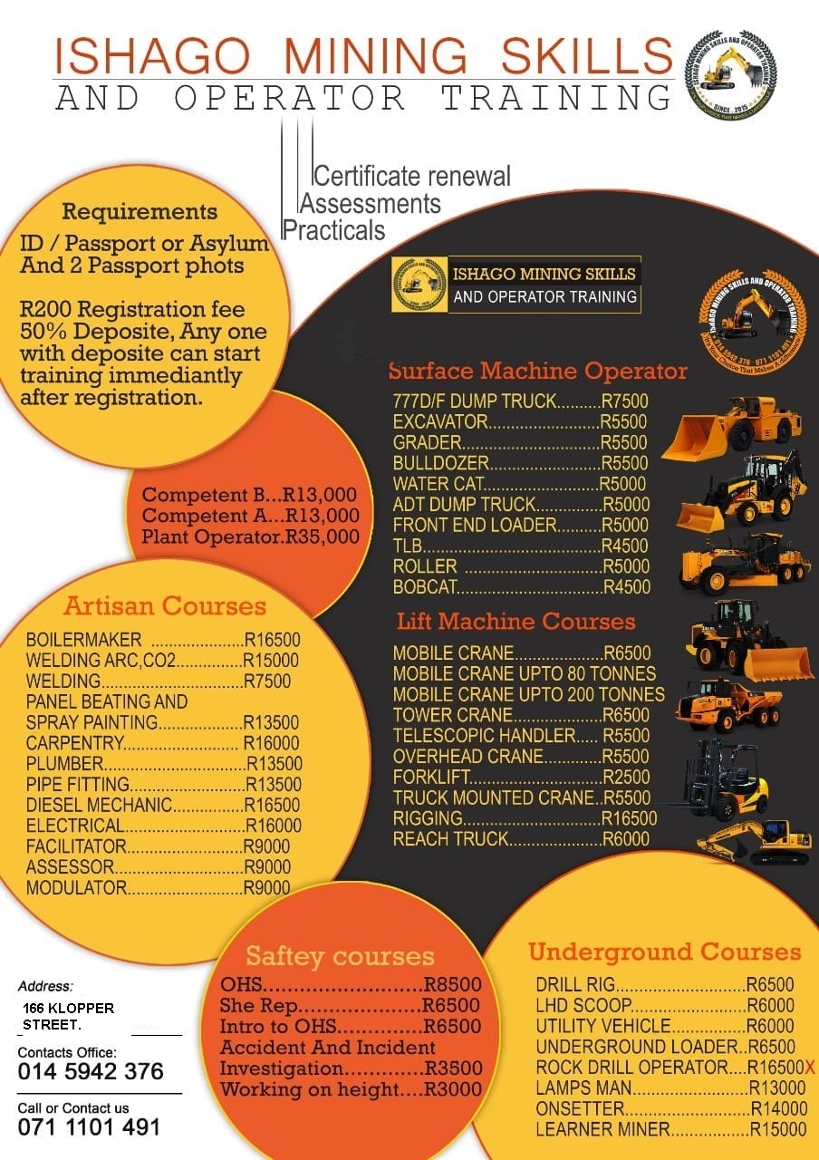 first aid level 1, 2 & 3 R3500, On-setter R12500, diesel mechanic R9000,