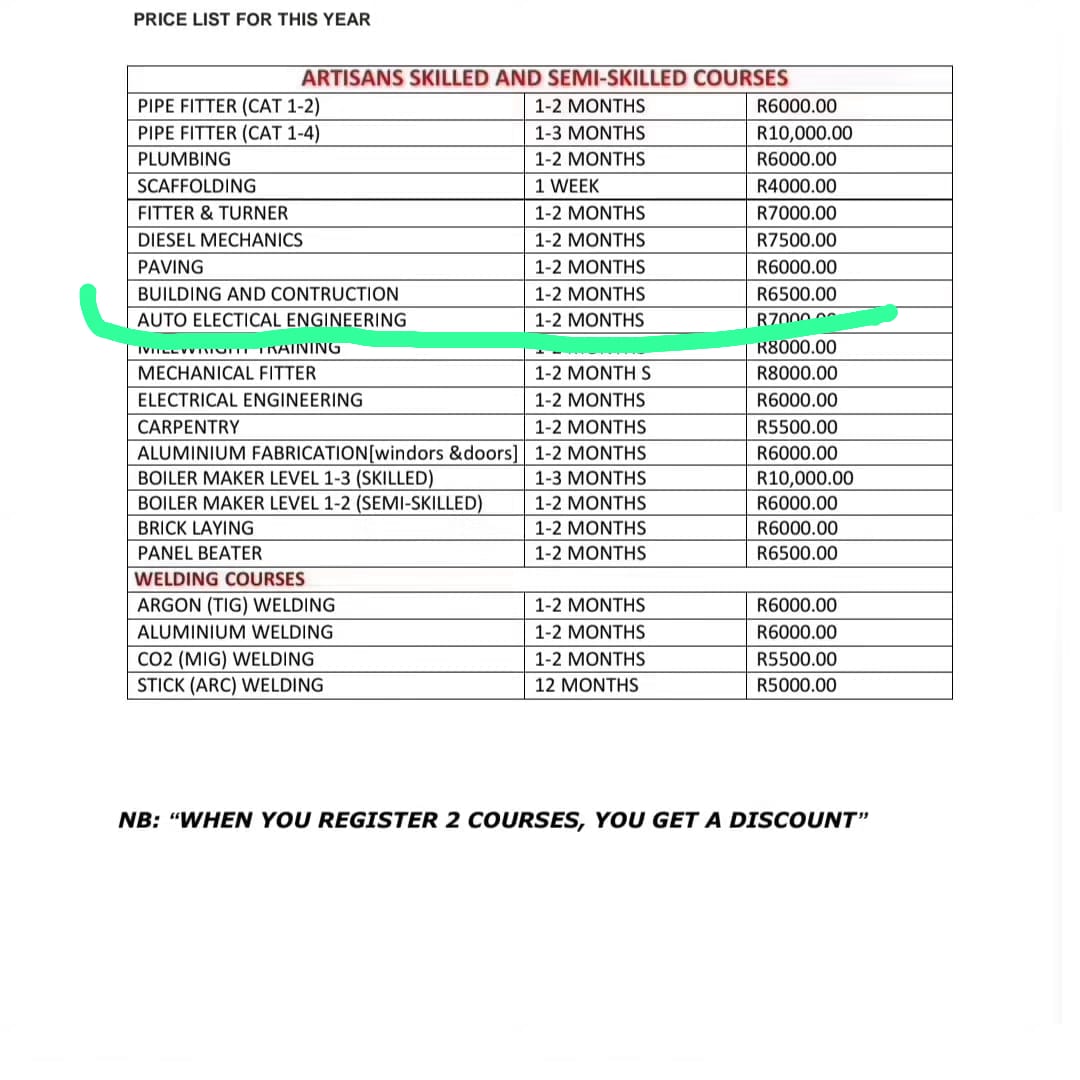 WE ALSO TRAIN ARTISAN COURSES(skilled and semi-skilled courses)which include;