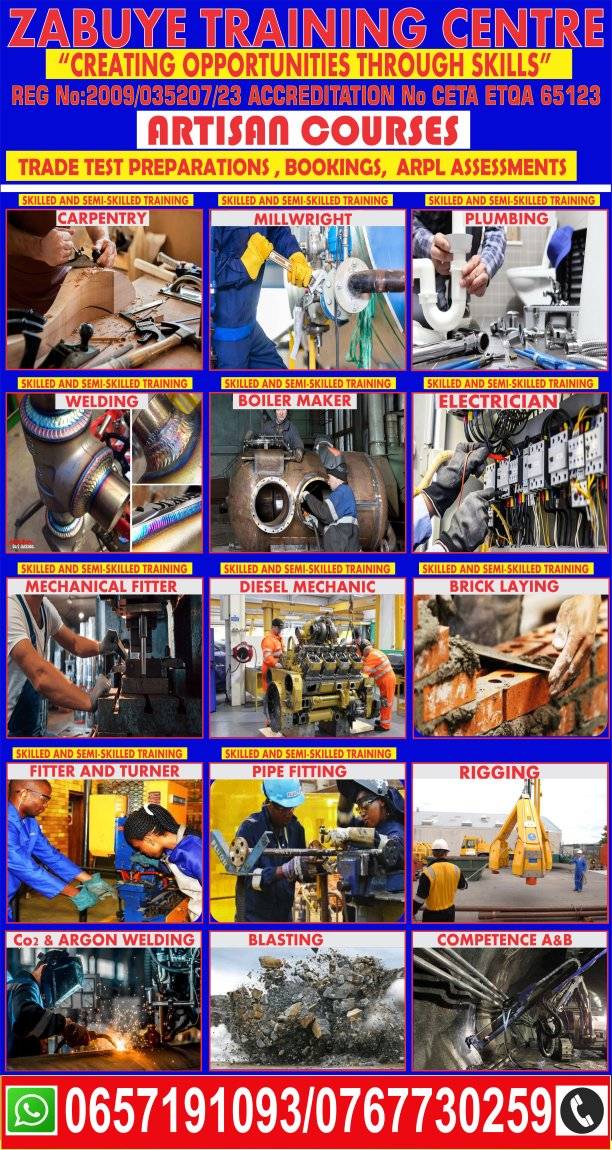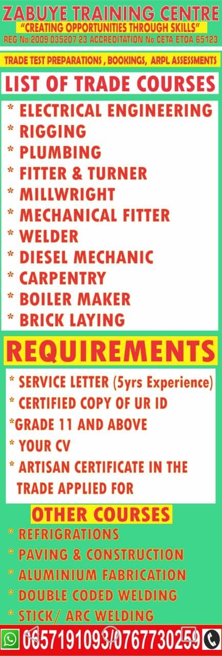 ZABUYE TRAINING CENTRE GERMISTON BRANCH. FOR DETAILS CALL +27657191093view more Trade test preparations in all courses like ,