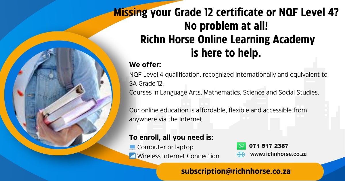 NQF level 4 qualification, recognized internationally and equivalent to SA Grade 12. Contact subscription@richnhorse.co.zaview email...