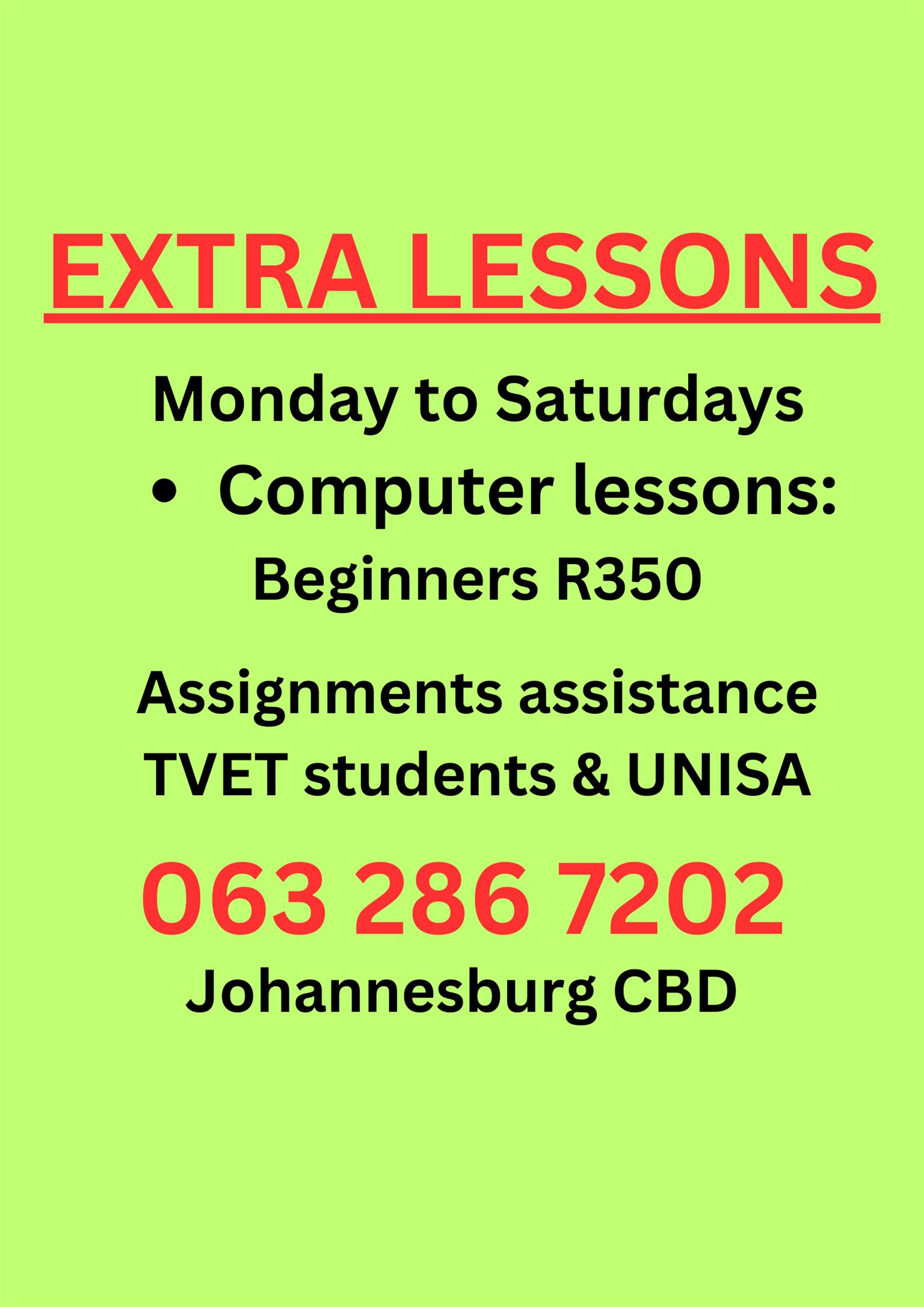 Extra Lessons: Computers beginners R350. Cell: 063 286 7202view more