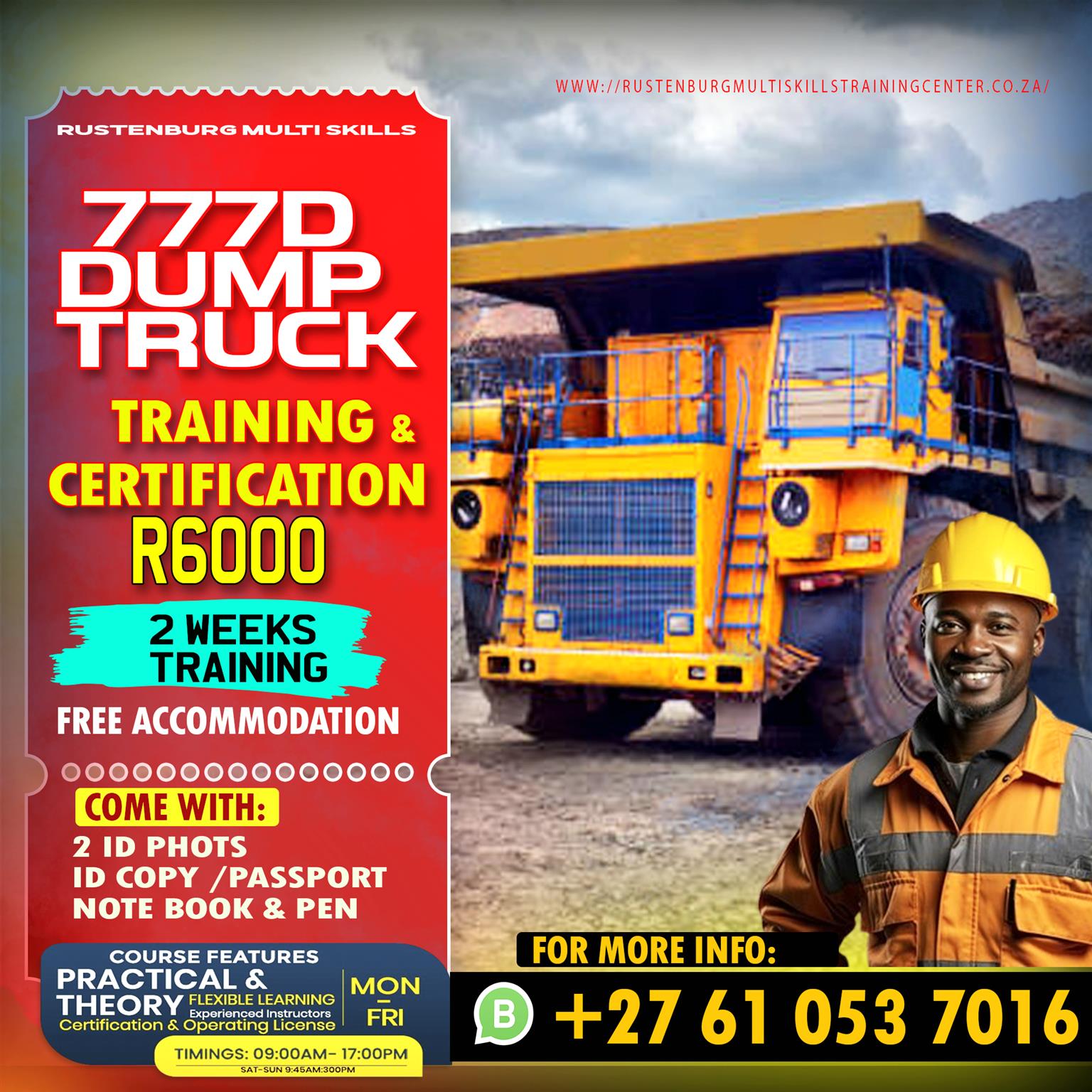 BEST TRAINERS OPERATORS MACHINES,WE TRAIN TO PASS NOT TO FAIL.ENROLL TO OUR 5 TO 7DAYS MACHINERY TRAINING AND RECEIVE OUR JOB ASSISTANCE THROUGH OUR TRUSTED COMPANIES THAT ASSIST OUR TRAINED STUDENTS WITH JOBS.WE ARE FULLY REGISTERED AND WE TRAIN BOTH THEORY AND PRACTICAL.FREE ACCOMMODATION AVAILABLE