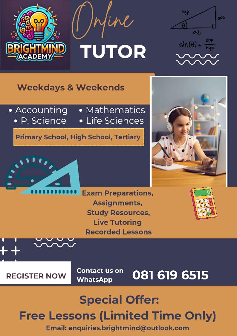 BrightMind Academy is a fully online tutoring platform providing high-quality academic support for primary, secondary, and tertiary students specializing in Mathematics, Physical Sciences, Accounting and Life Sciences. Our mission is to make education accessible, personalized, and effective through a network of professional tutors.