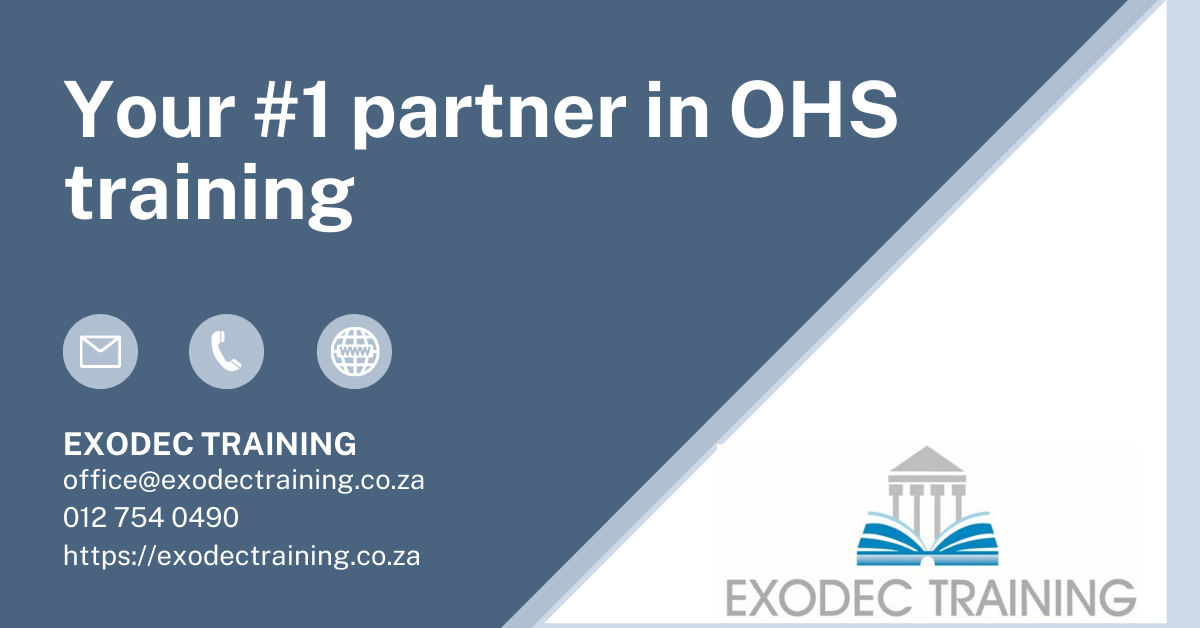 EXODEC TRAINING provides training on a wide-range of safety, health and environmental topics, including first aid, fire fighting, SHE rep, personal protective equipment (PPE), convey dangerous goods, cranes, risk assessment, driven machinery and other occupational and general safety topics. Most of these courses are required by law. Accredited certificates and licenses for lift trucks, different cranes etc. are issued with TETA and DOL accreditation. Office: 012 754 0490view more. Mail: office@exodectraining.co.zaview email...