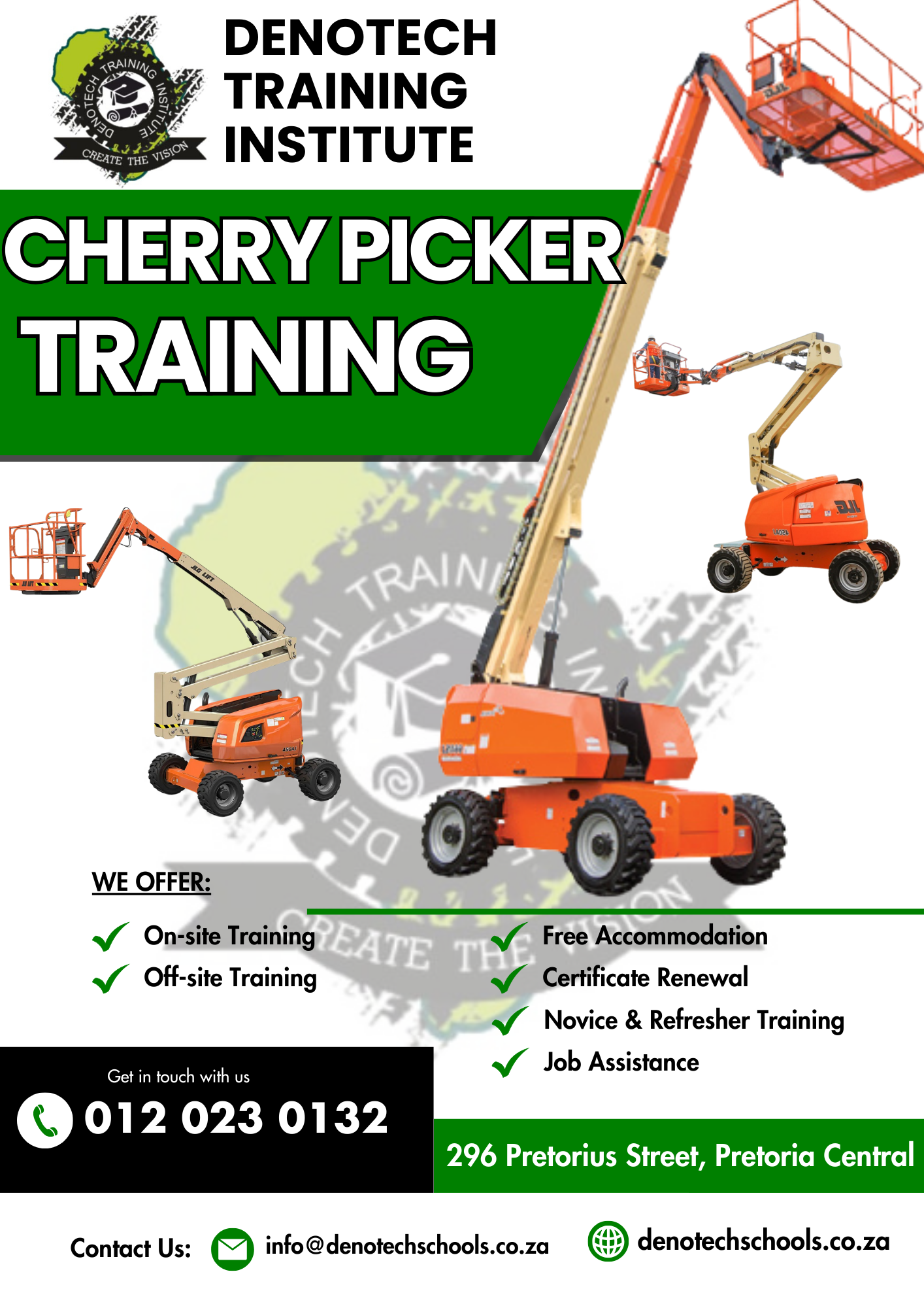We train operators of cherry picker and other lifting machines. We are located in Pretoria CBD next to Steers. We offer free accommodation to our learners and have job assistance program after training. For more information, visit our website www.denotechschools.co.za
