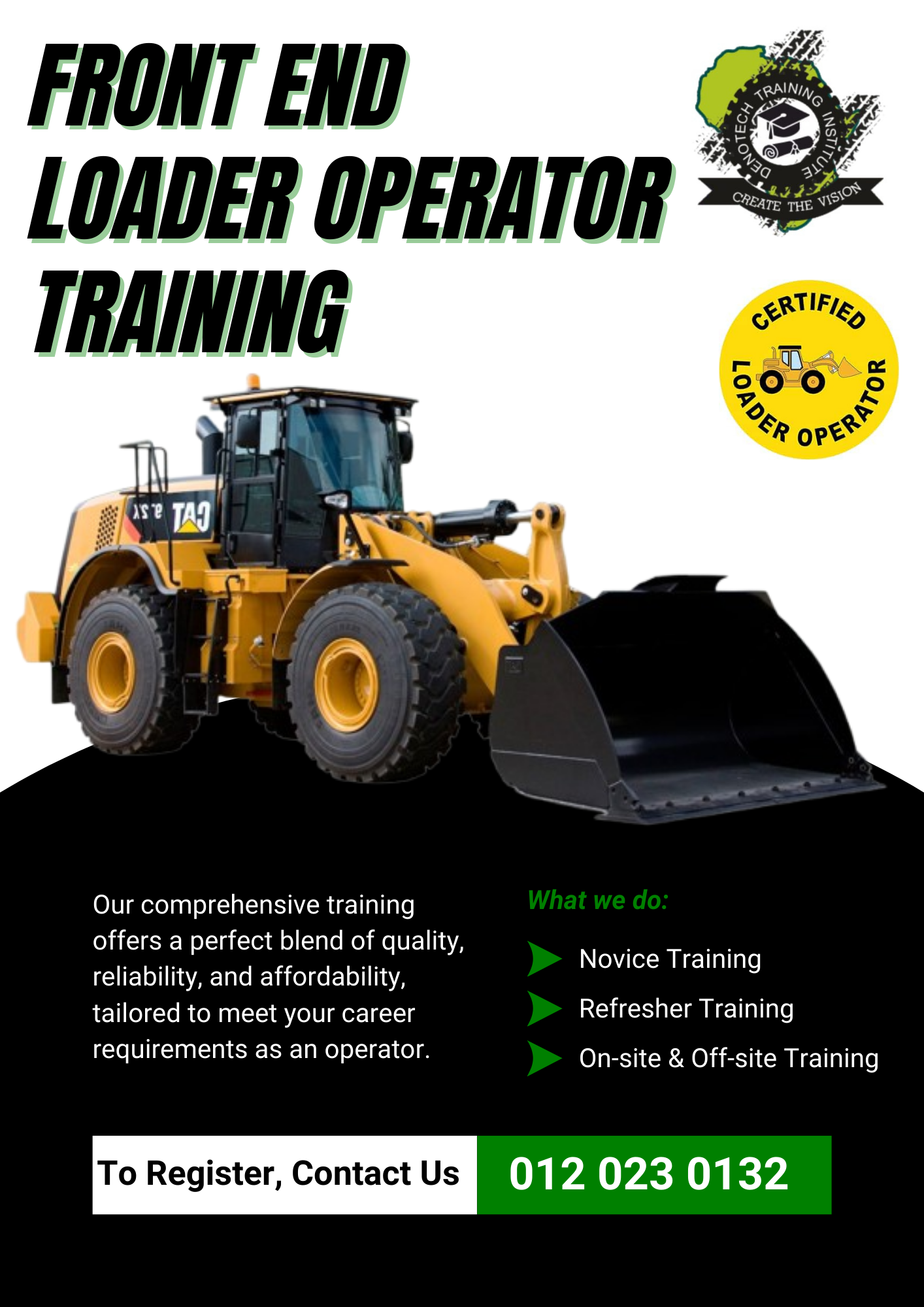We train operators of Front end loader and other mining and construction machinery. Visit our website www.denotechschools.co.za for more information