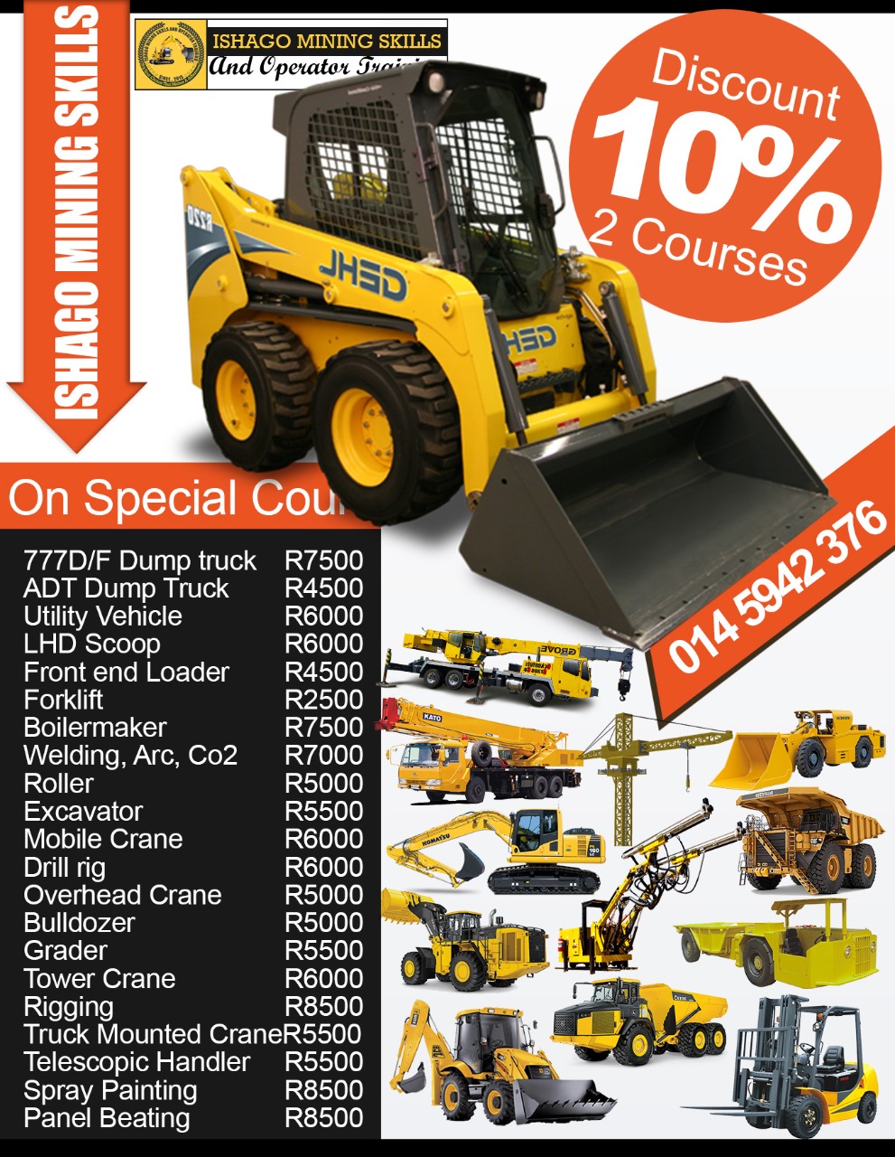 roller R4500, boiler maker R8000, bob cat R3500, forklift R2500,