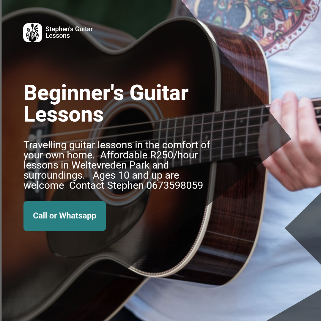 I offer fun, beginner-friendly guitar lessons for ages 10 and up β and I come to your home for R250/hour