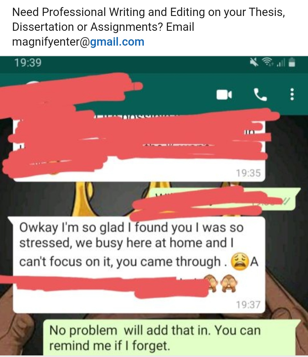 We are able to write for your assignments and dissertations/ thesis. We work fully online so we can assist you if you're across South Africa. We have previously assisted students from a range if higher learning institutions such as: UNISA, UKZN, DUT, MUT, NMMU, Boston Business College, Regent, Mancosa, Rosebank, TVET, UJ, UP, Vaal University of Technology etc.
