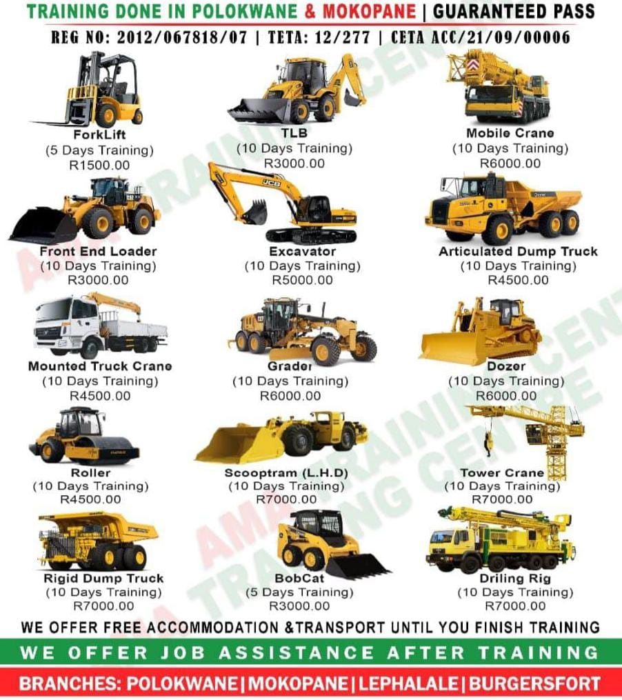 Our competitive short courses designed for construction and mining industry. TLB Forklifts and Dump trucks NQF Level 2. No matric required, Train at your own pace.